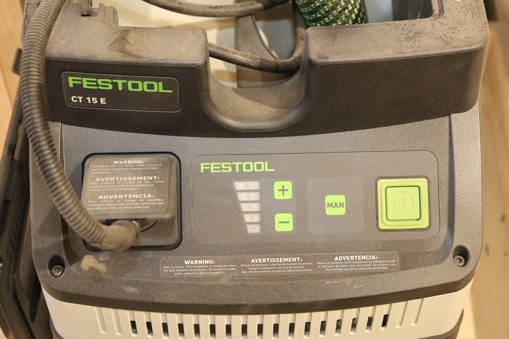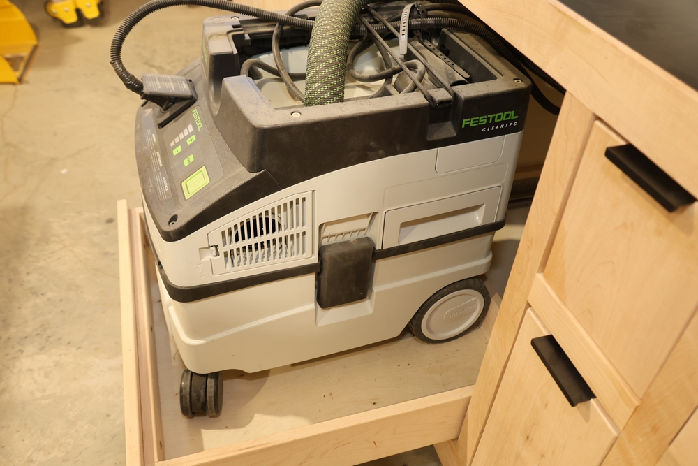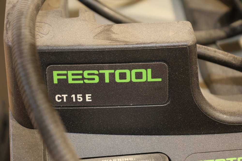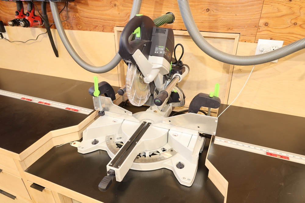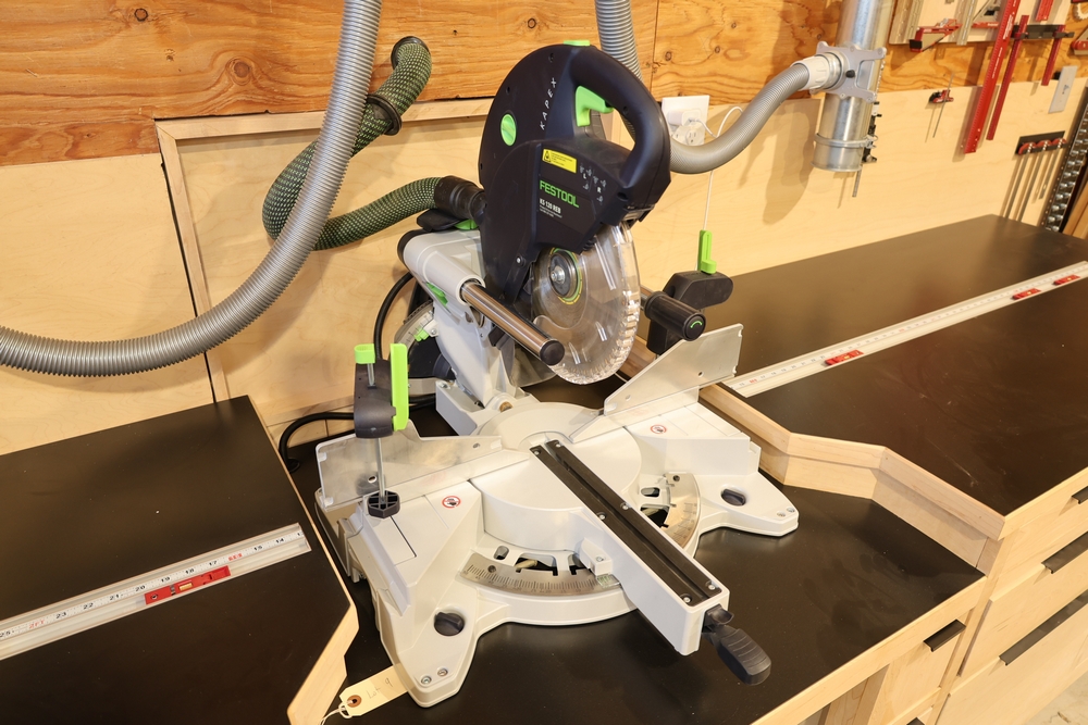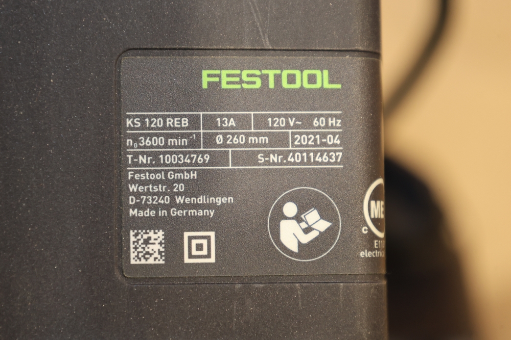 Festool KS 120 REB sliding compound miter saw paired with a Festool CT 15 E HEPA dust extractor, mounted in a custom-built woodworking workstation with integrated cabinetry and work surfaces. Setup includes the miter saw installed flush into the table with fence extensions, dust collection hose connected, and the CT 15 E extractor housed below in a dedicated pull-out compartment. Branding, model identification, and electrical information are visible on the equipment, and the custom table appears purpose-built to support the saw and dust collection system as shown, on casters. Buyer must take all. Excludes the contents of the drawers. No equipment is onsite to assist loading. Bring the proper tools, equipment, and help needed to load your items. Seller reports: nearly all the powertool (especially Festools) are in fantastic condition, low low use and have been kept in climate controlled garage.