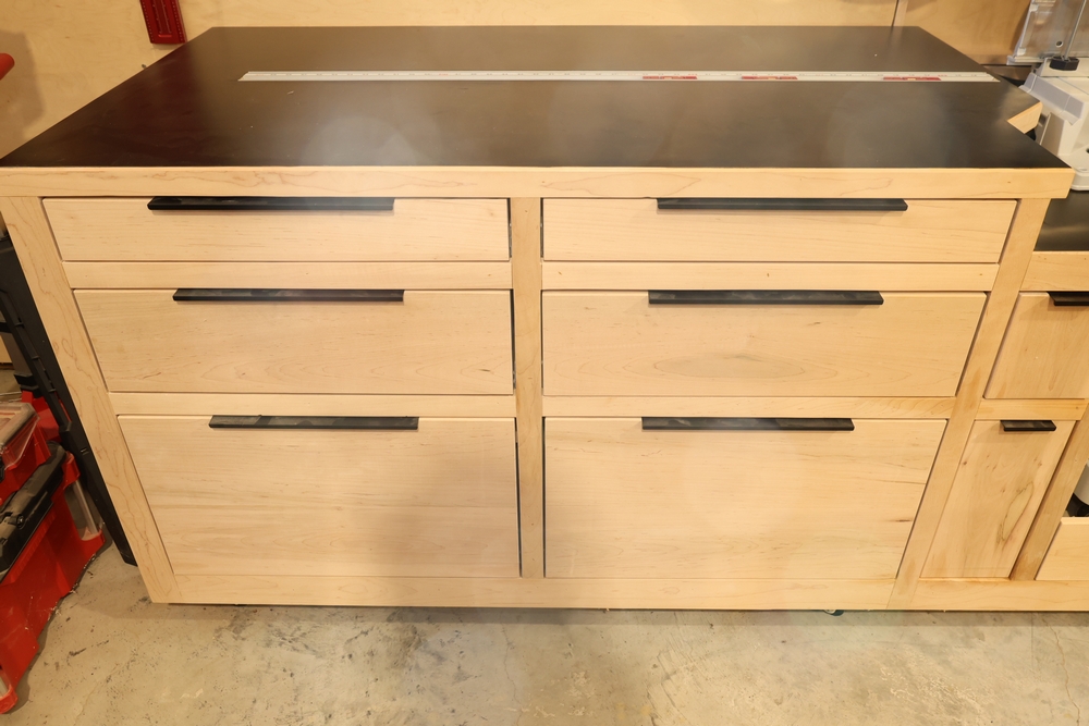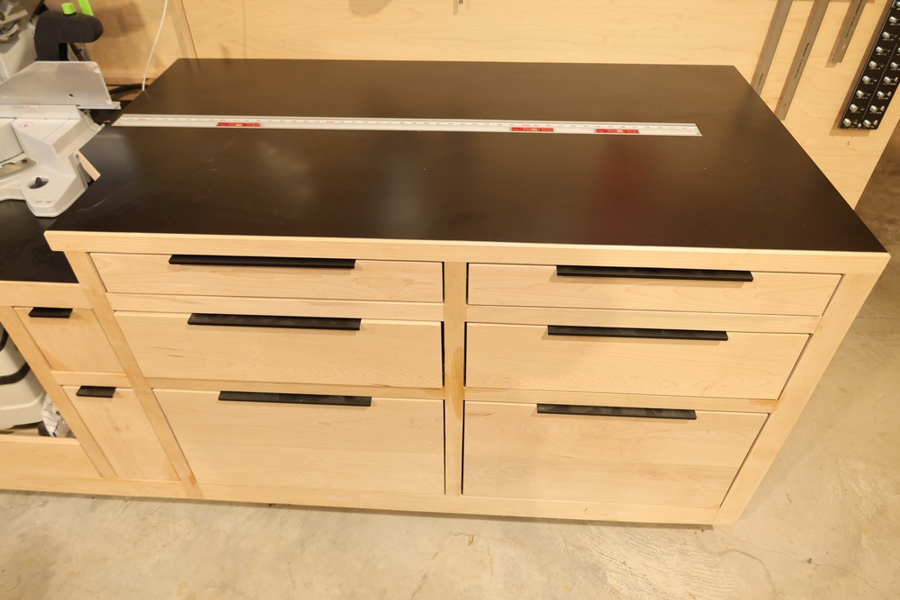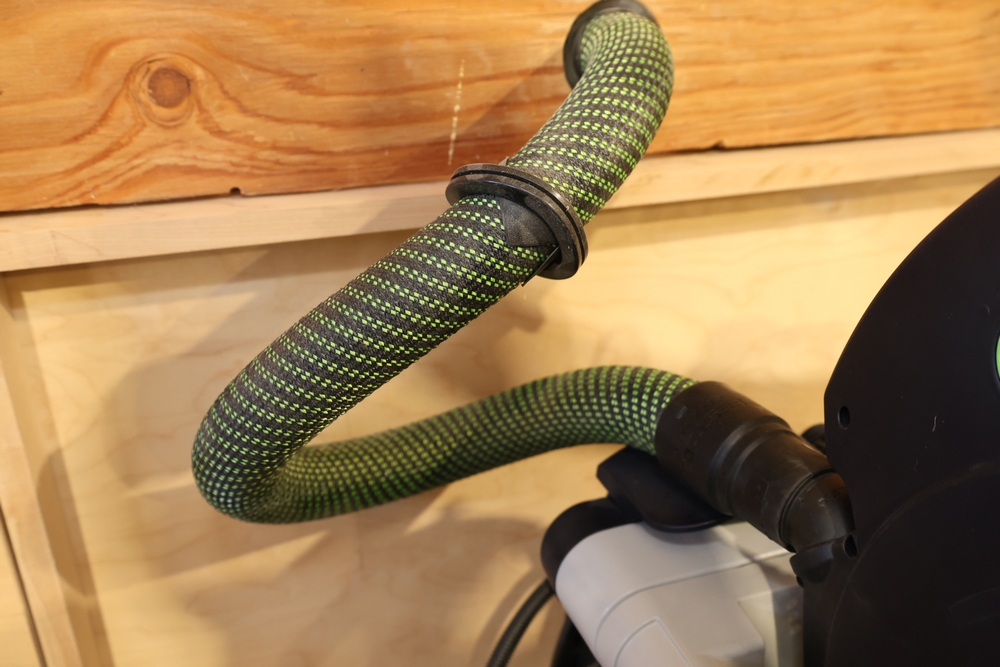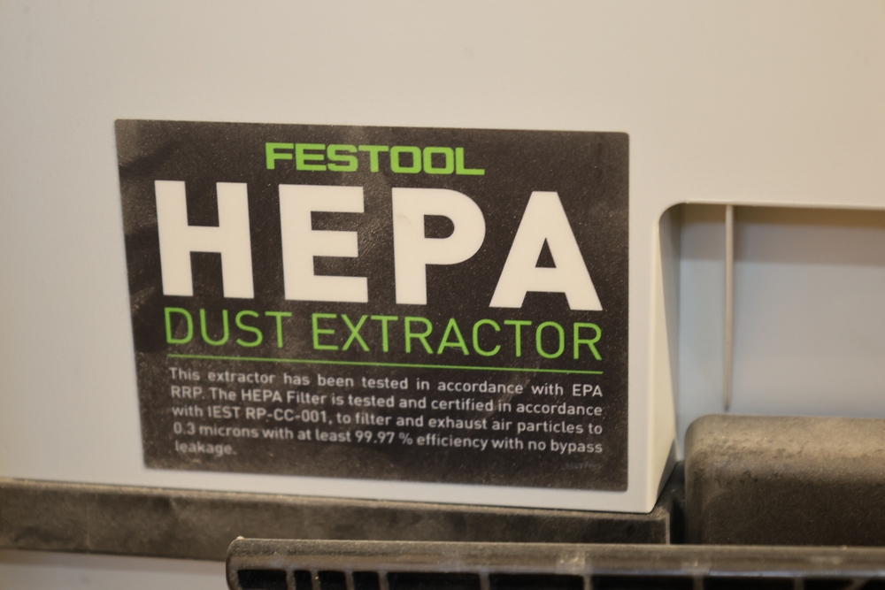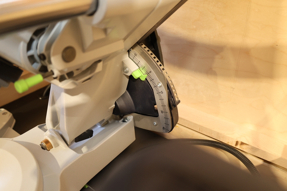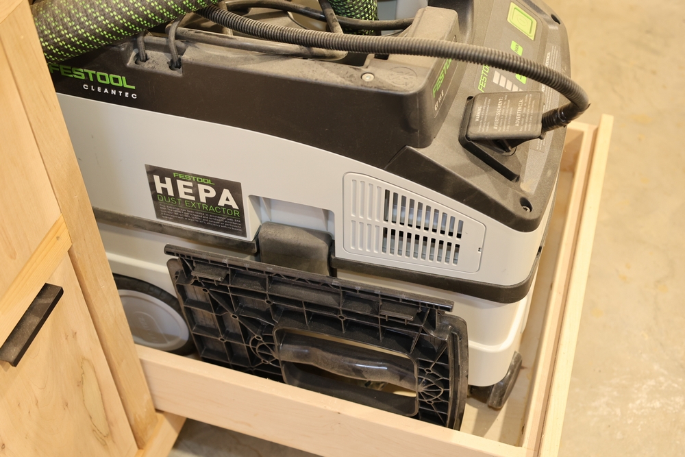 Festool KS 120 REB sliding compound miter saw paired with a Festool CT 15 E HEPA dust extractor, mounted in a custom-built woodworking workstation with integrated cabinetry and work surfaces. Setup includes the miter saw installed flush into the table with fence extensions, dust collection hose connected, and the CT 15 E extractor housed below in a dedicated pull-out compartment. Branding, model identification, and electrical information are visible on the equipment, and the custom table appears purpose-built to support the saw and dust collection system as shown, on casters. Buyer must take all. Excludes the contents of the drawers. No equipment is onsite to assist loading. Bring the proper tools, equipment, and help needed to load your items. Seller reports: nearly all the powertool (especially Festools) are in fantastic condition, low low use and have been kept in climate controlled garage.
