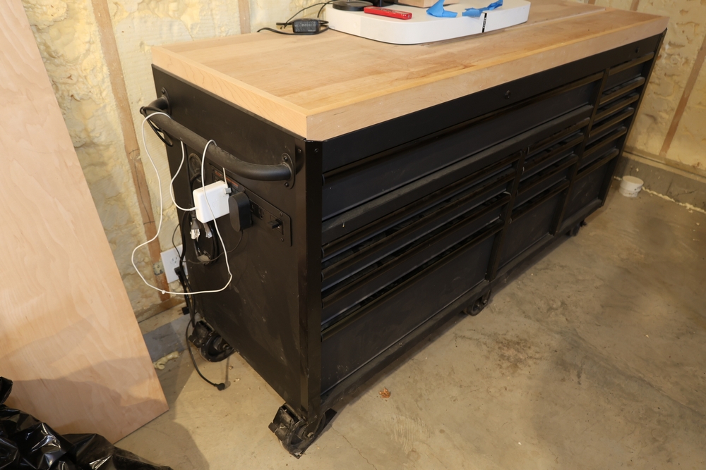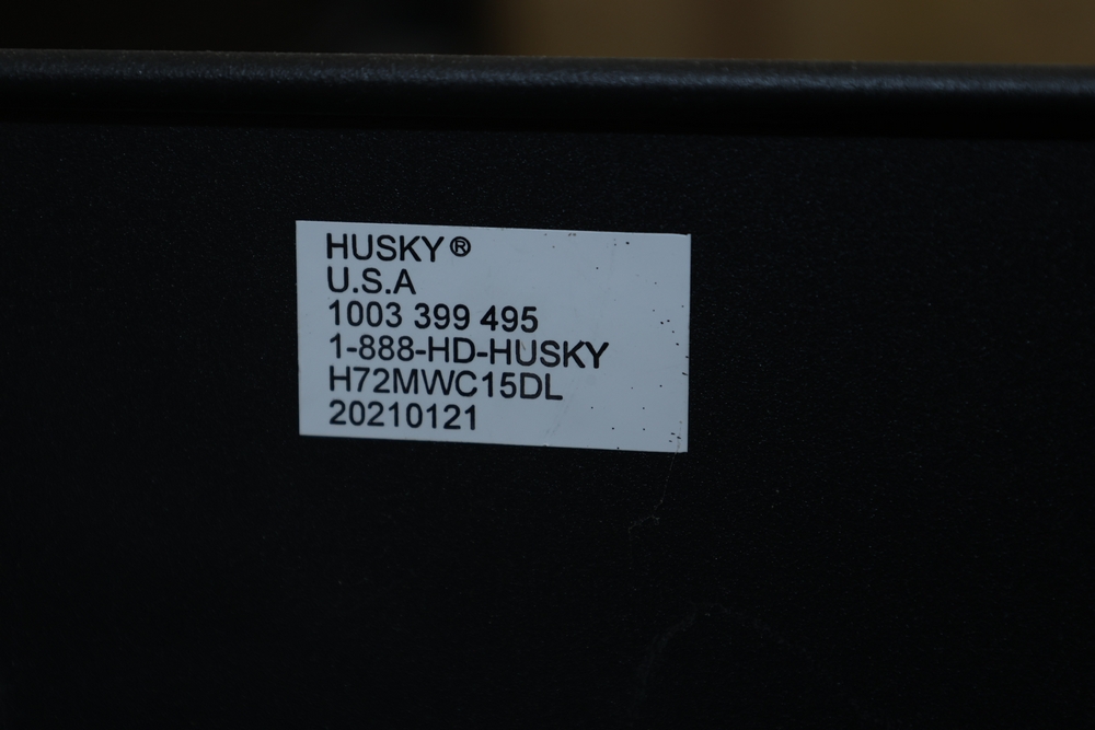 Husky rolling workbench, model H72MWC15DL, featuring a solid wood work surface measuring approximately 72 inches wide and 24 inches deep, with an overall working height of approximately 37 inches. The cabinet is equipped with multiple full-width drawers on heavy-duty casters and includes a built-in power strip mounted to the side. This lot includes the workbench only; no contents are included on the top surface or inside the drawers. Excludes all contents. No equipment is onsite to assist loading. Bring the proper tools, equipment, and help needed to load your items.