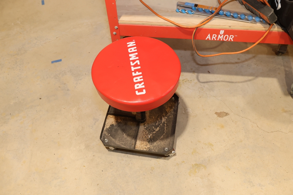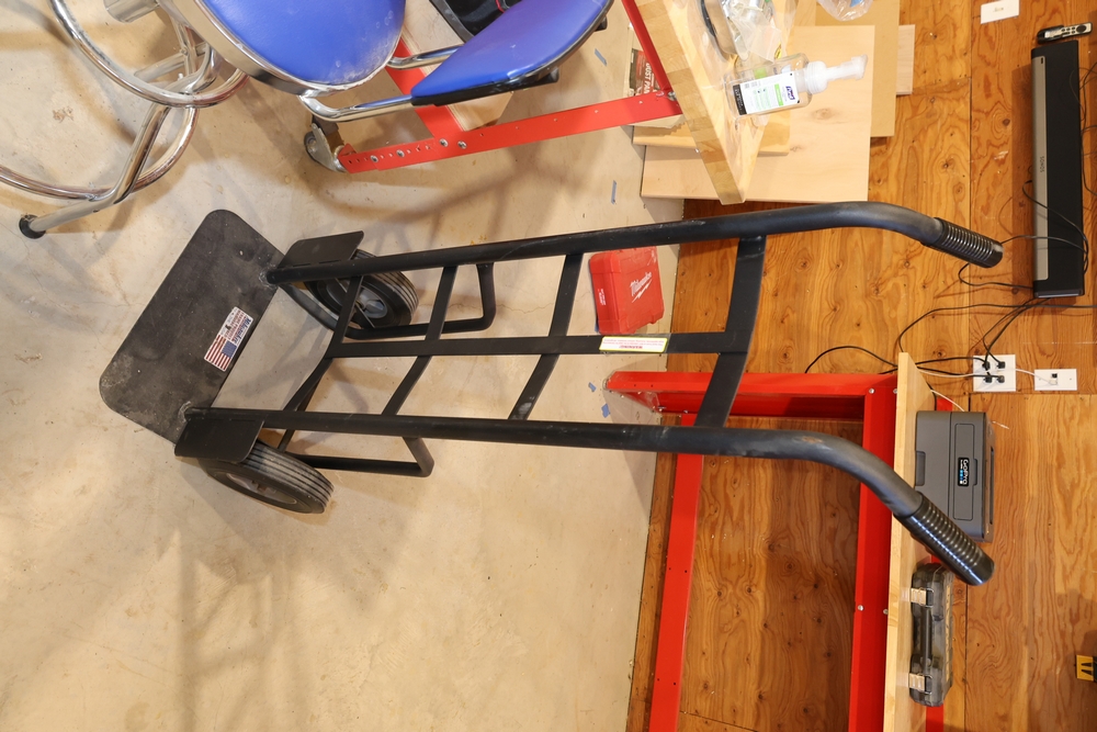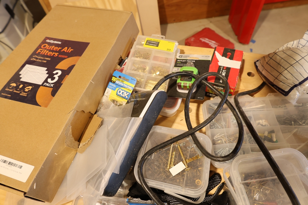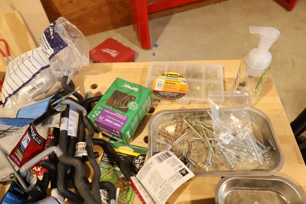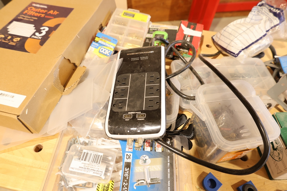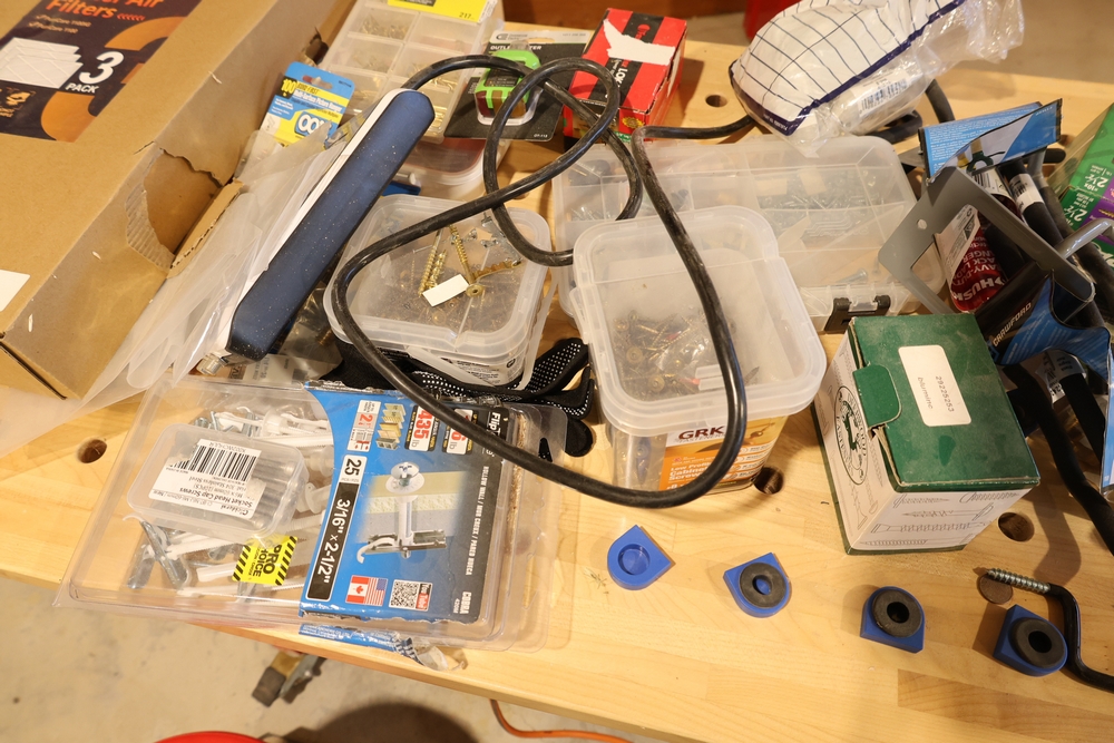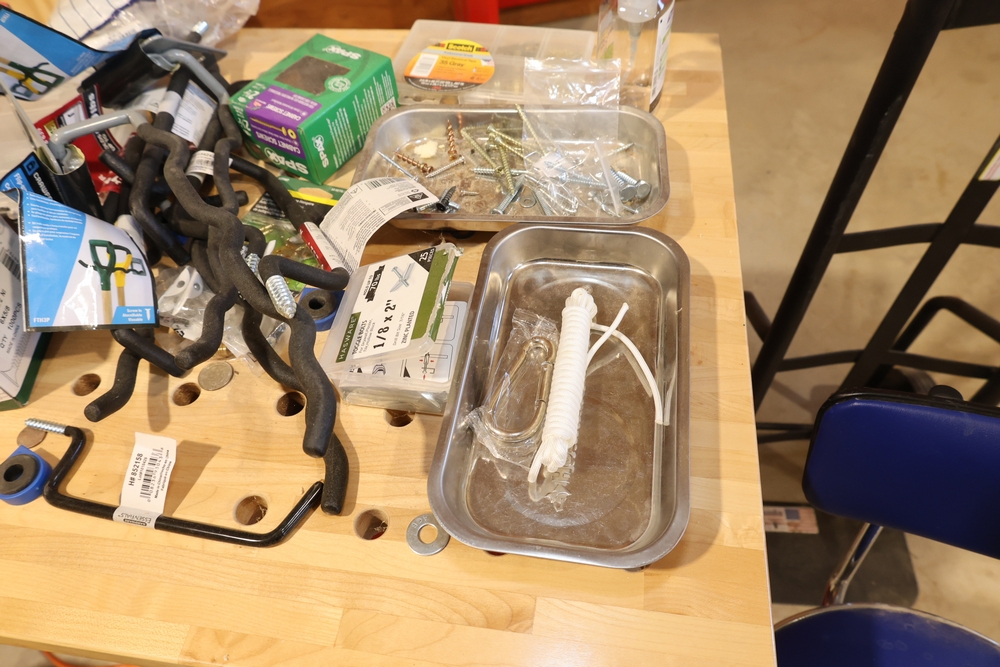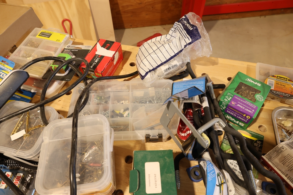ARMOR steel workbench with laminated wood top on casters, measuring approximately 54 inches wide and 38 inches high, with a red steel frame and lower shelf. Lot includes contents stored on and around the bench, including assorted hardware and fasteners in organizers, chains and hooks, outlet tester, extension cords, air filters, small parts bins, and hand tools, along with a Craftsman rolling shop stool, a Kobalt stool, and a hand truck, all included as one lot. No equipment is onsite to assist loading. Bring the proper tools, equipment, and help needed to load your items.