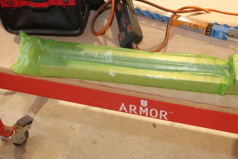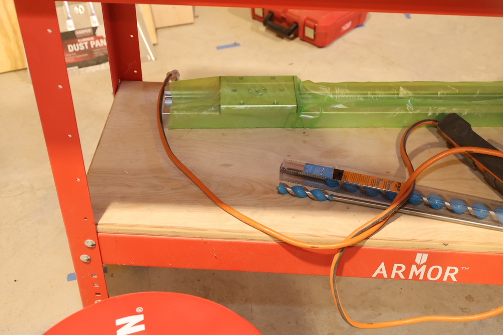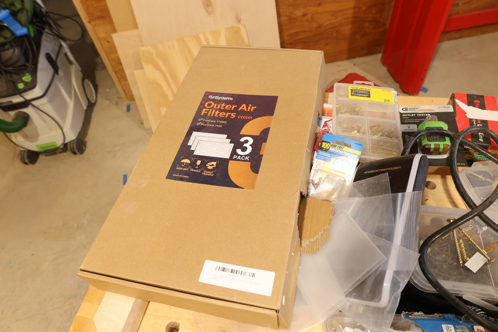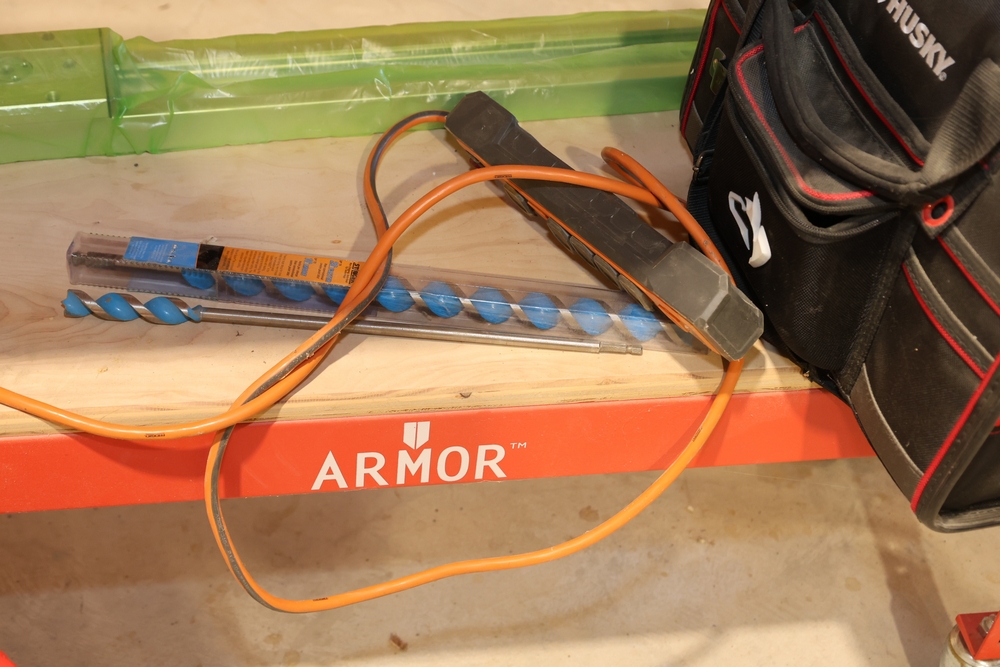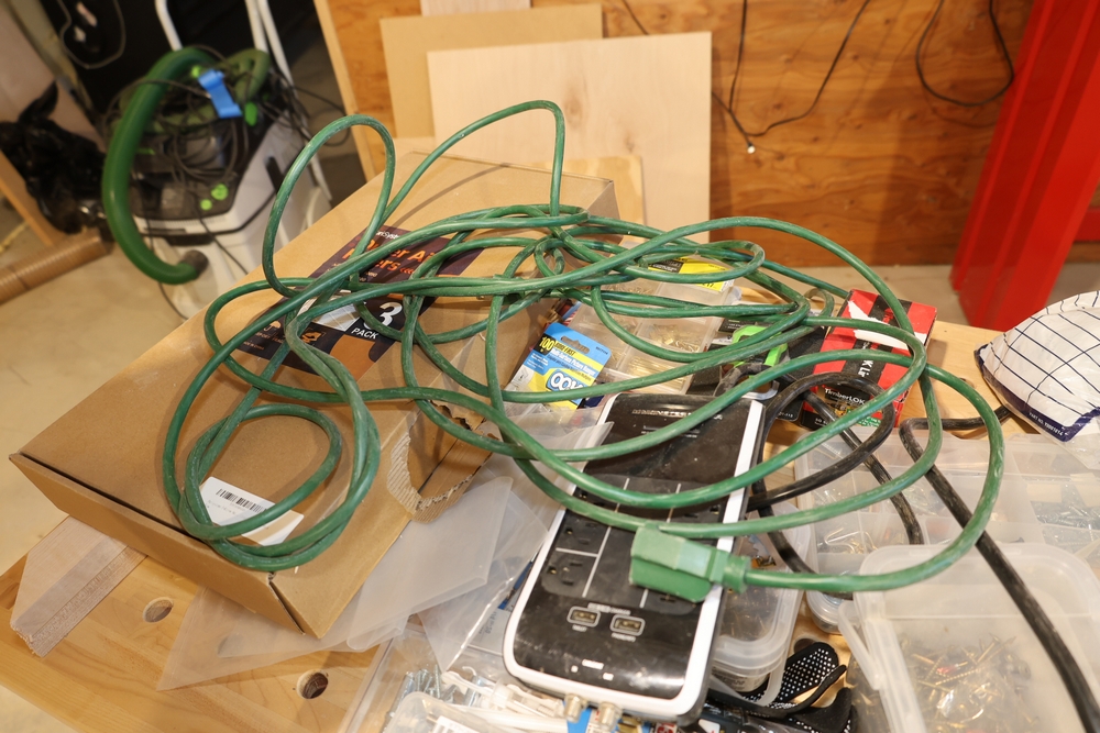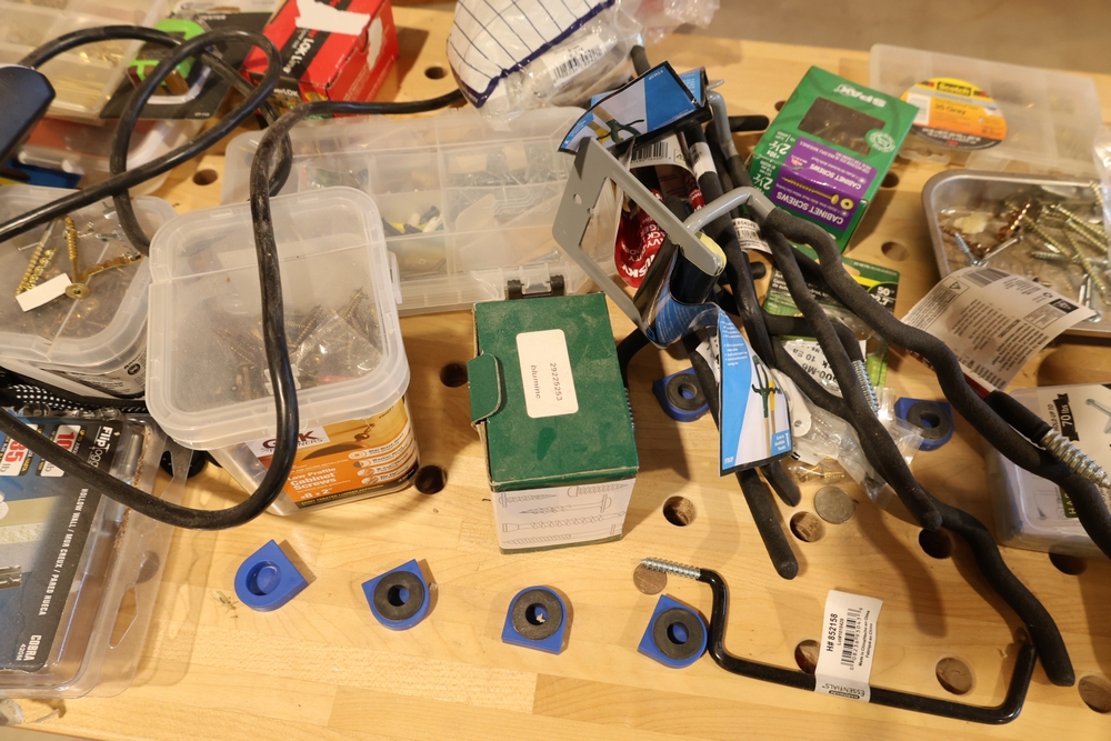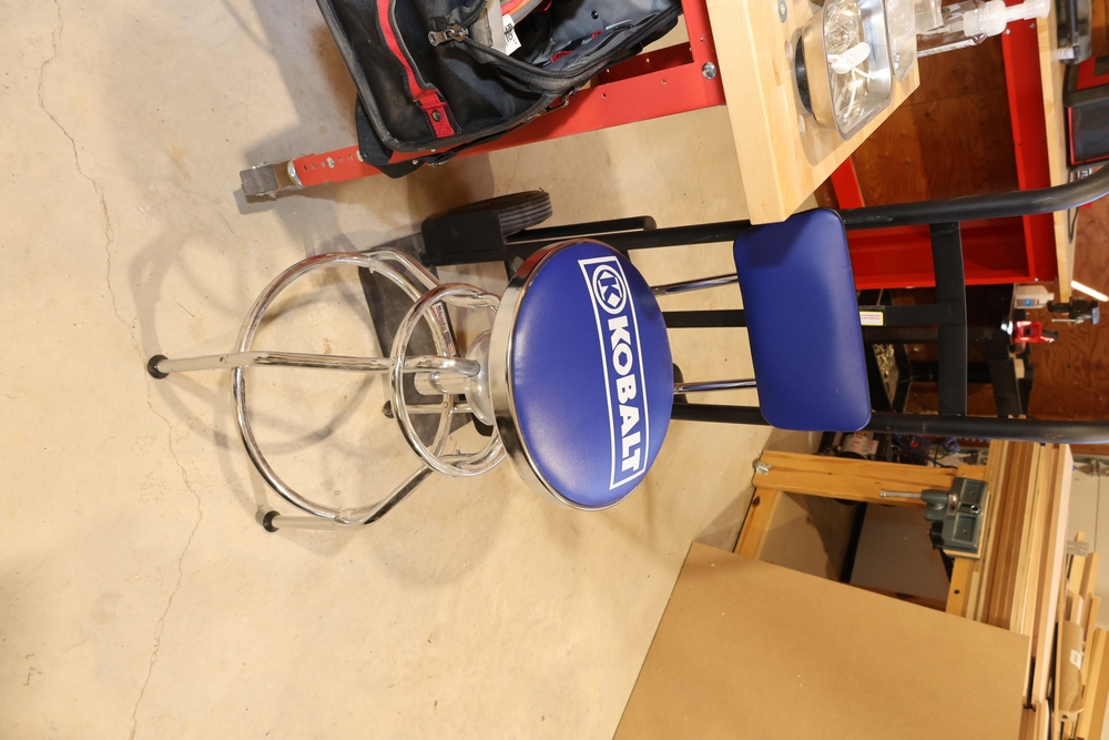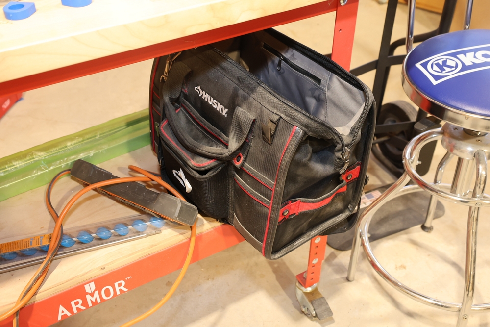 ARMOR steel workbench with laminated wood top on casters, measuring approximately 54 inches wide and 38 inches high, with a red steel frame and lower shelf. Lot includes contents stored on and around the bench, including assorted hardware and fasteners in organizers, chains and hooks, outlet tester, extension cords, air filters, small parts bins, and hand tools, along with a Craftsman rolling shop stool, a Kobalt stool, and a hand truck, all included as one lot. No equipment is onsite to assist loading. Bring the proper tools, equipment, and help needed to load your items.