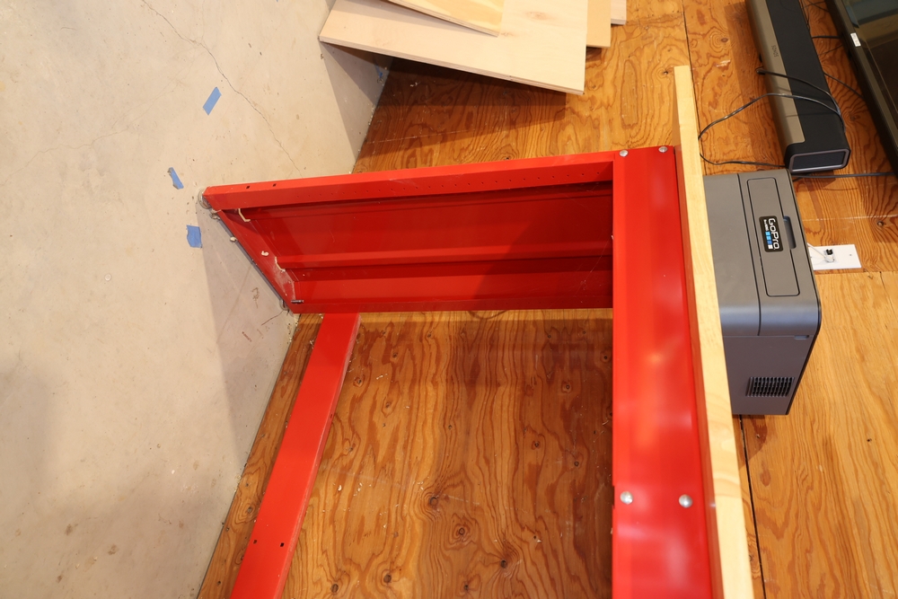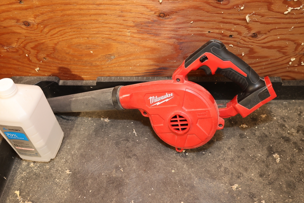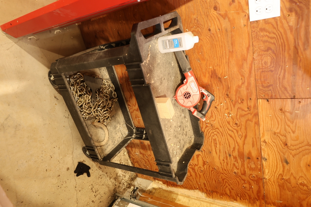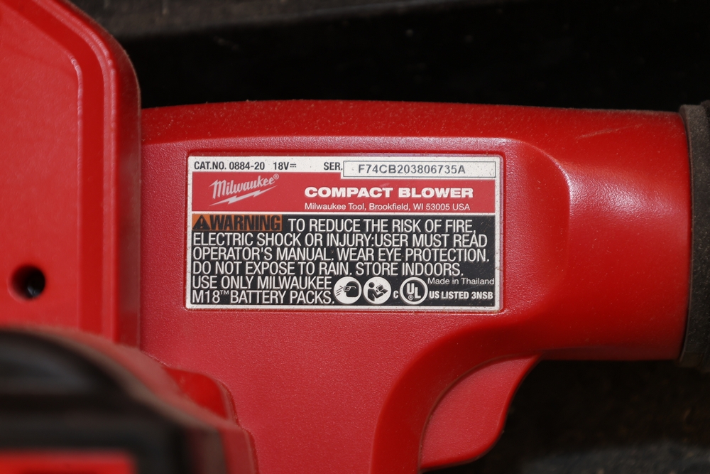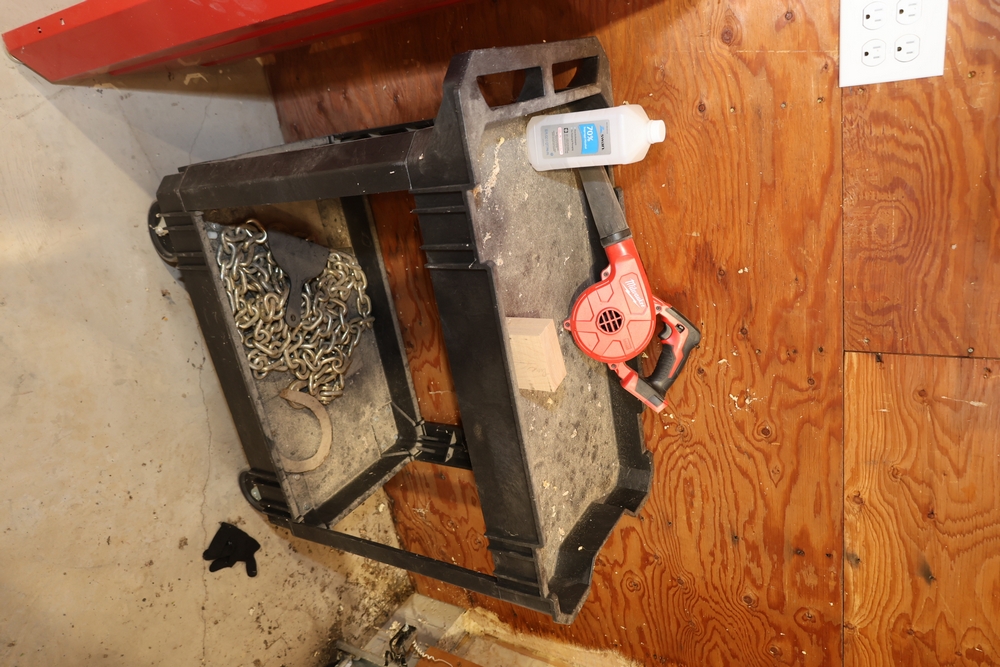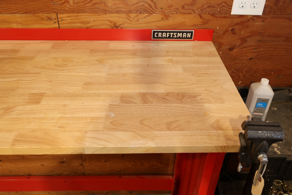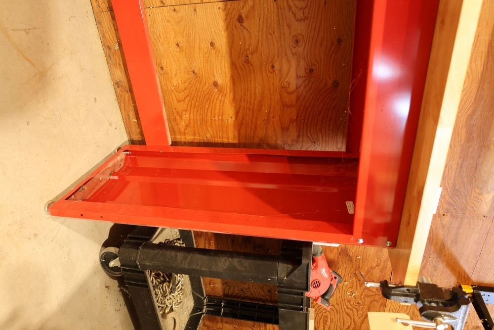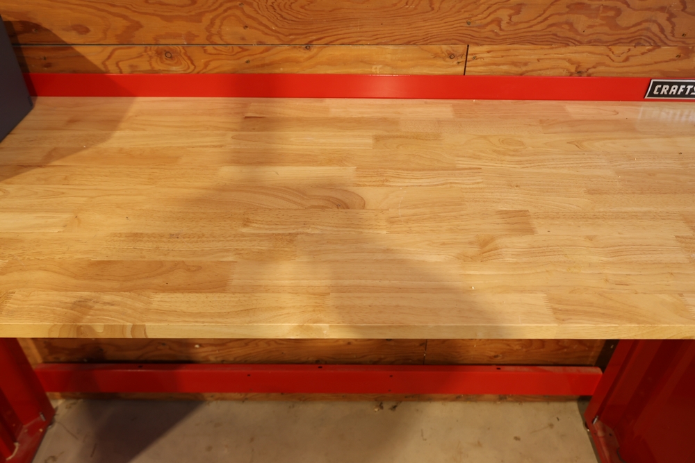 Craftsman steel workbench with laminated wood top and red painted steel frame, with rear Craftsman nameplate. Also includes a black plastic rolling utility cart with steel chain stored in the lower tray, a Milwaukee M18 compact blower, a small bench vise mounted to the cart. No equipment is onsite to assist loading. Bring the proper tools, equipment, and help needed to load your items.