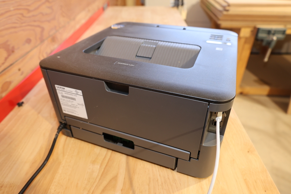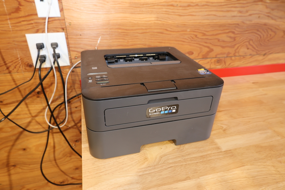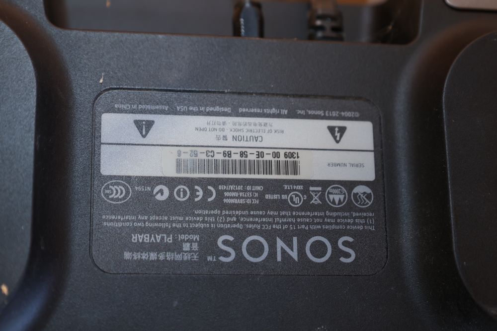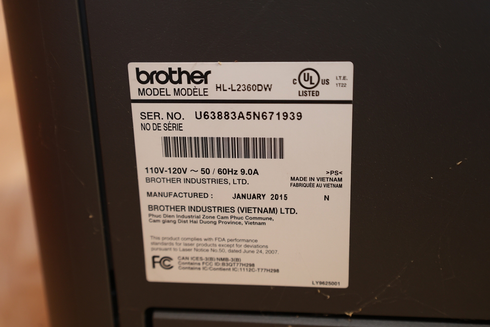 Brother HL-L2360DW monochrome laser printer, manufactured January 2015, 110–120V, 50/60Hz, 9.0A. Also included is a Sonos PLAYBAR soundbar, model PLAYBAR. No equipment is onsite to assist loading. Bring the proper tools, equipment, and help needed to load your items.