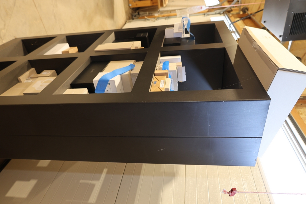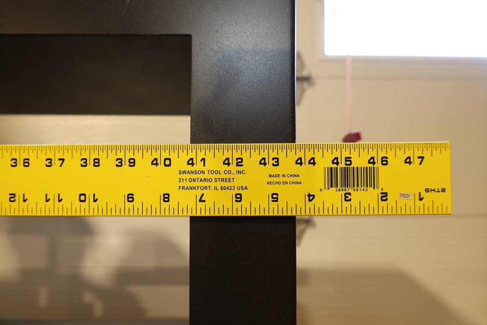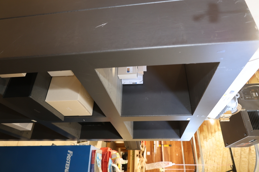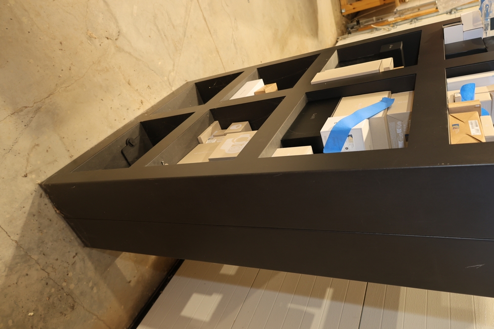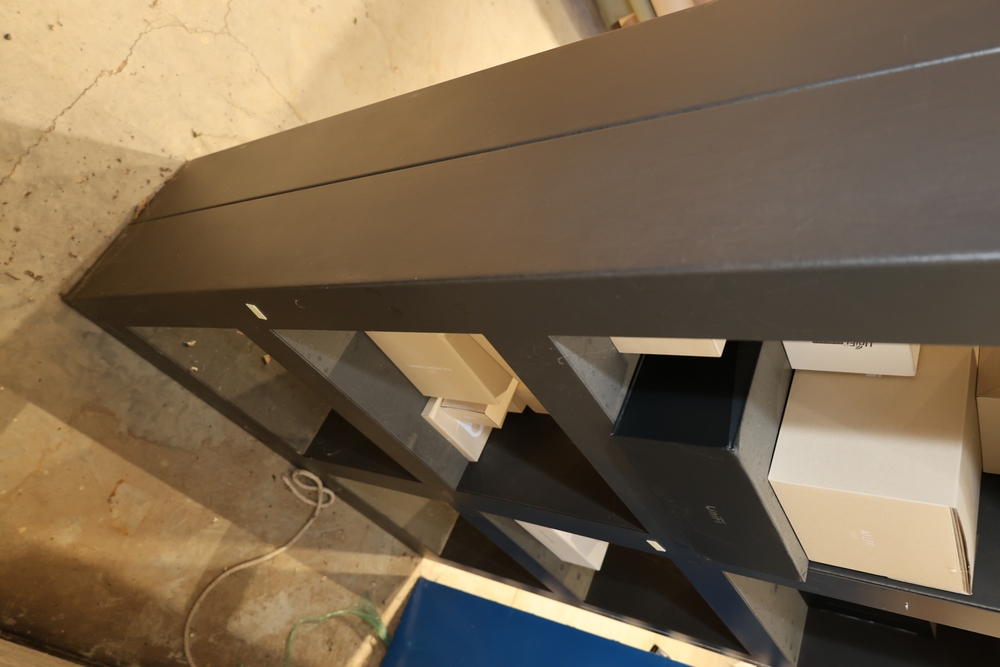 Black metal 8-cube shelving unit measuring approximately 48 inches wide, 16 inches deep, and 72 inches high. Features a rectangular frame with eight open storage compartments in a two-by-four configuration and a flat top surface. Freestanding design suitable for shop, garage, office, or retail display use. Contents not included. No equipment is onsite to assist loading. Bring the proper tools, equipment, and help needed to load your items.