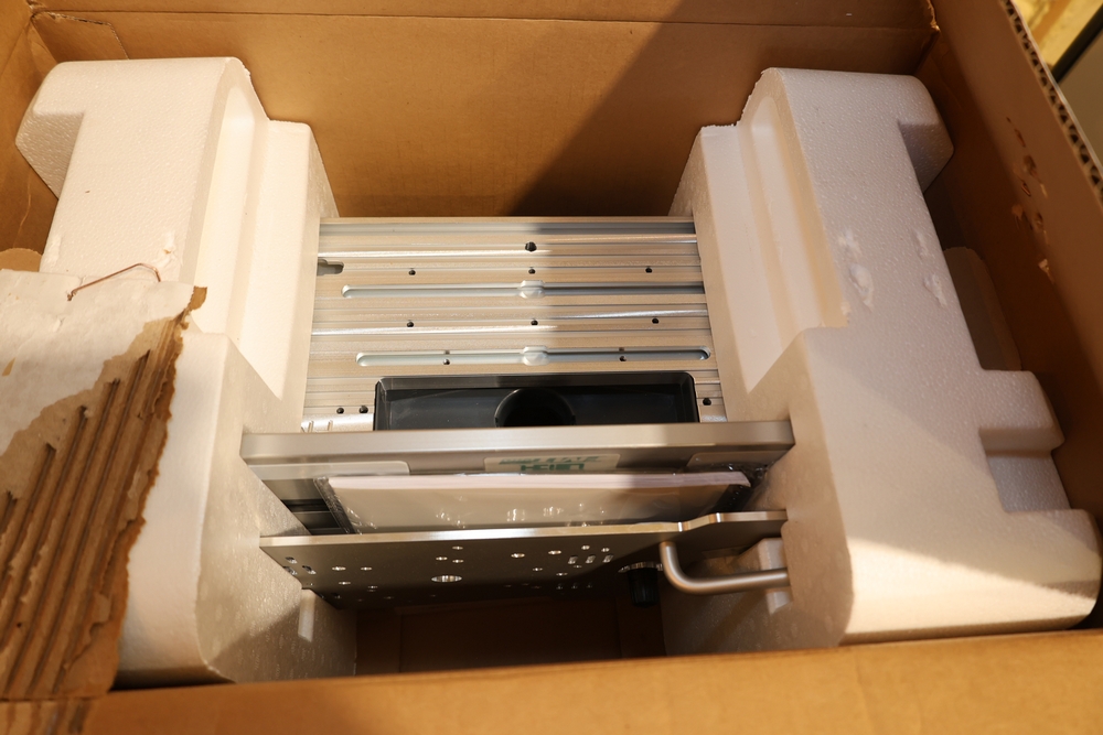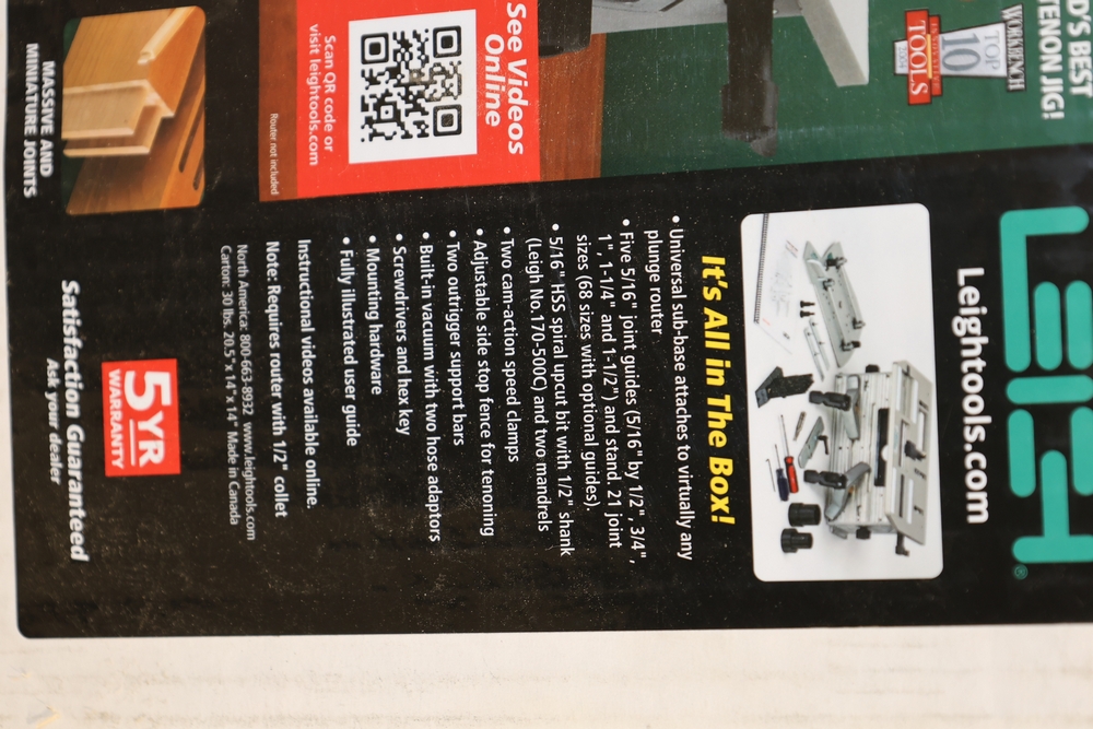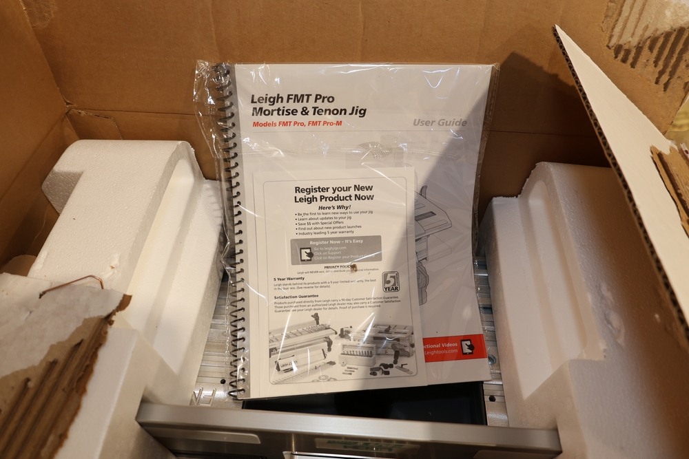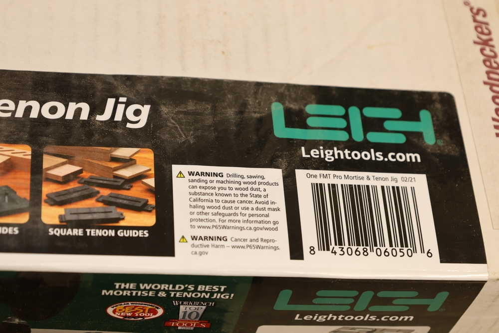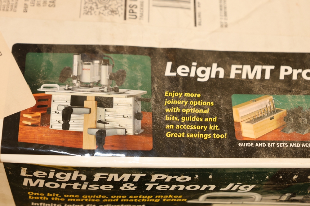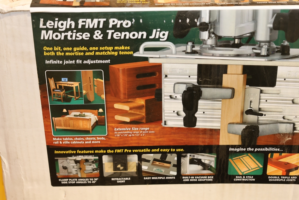 Leigh FMT Pro Mortise and Tenon Jig, model FMT Pro, in original box with foam inserts, includes user guide, mounting hardware, clamps, guides, and associated components as packaged. No equipment is onsite to assist loading. Bring the proper tools, equipment, and help needed to load your items.