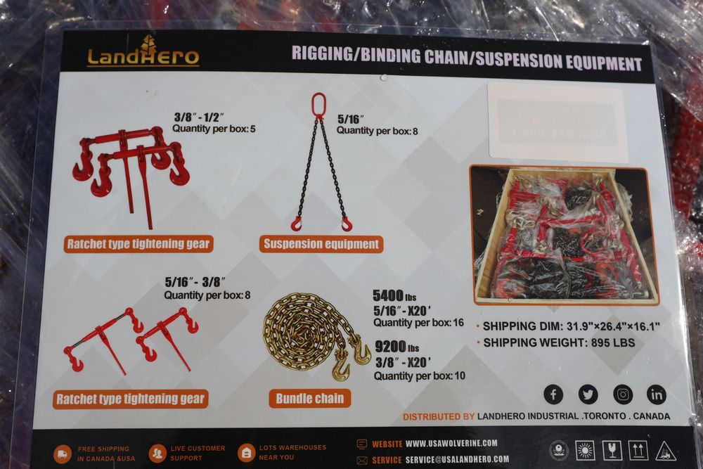 New 2026 New Landhero rigging, binding chain, and suspension equipment model: LDH-GAC40Y including 10 9200lbs 3/8"x20' chains, 16 5400lbs 5/16"x20' chains, 8 5/16" lifting chains, 5 3/8"-1/2" binders, and 8 5/16"-3/8" binders.