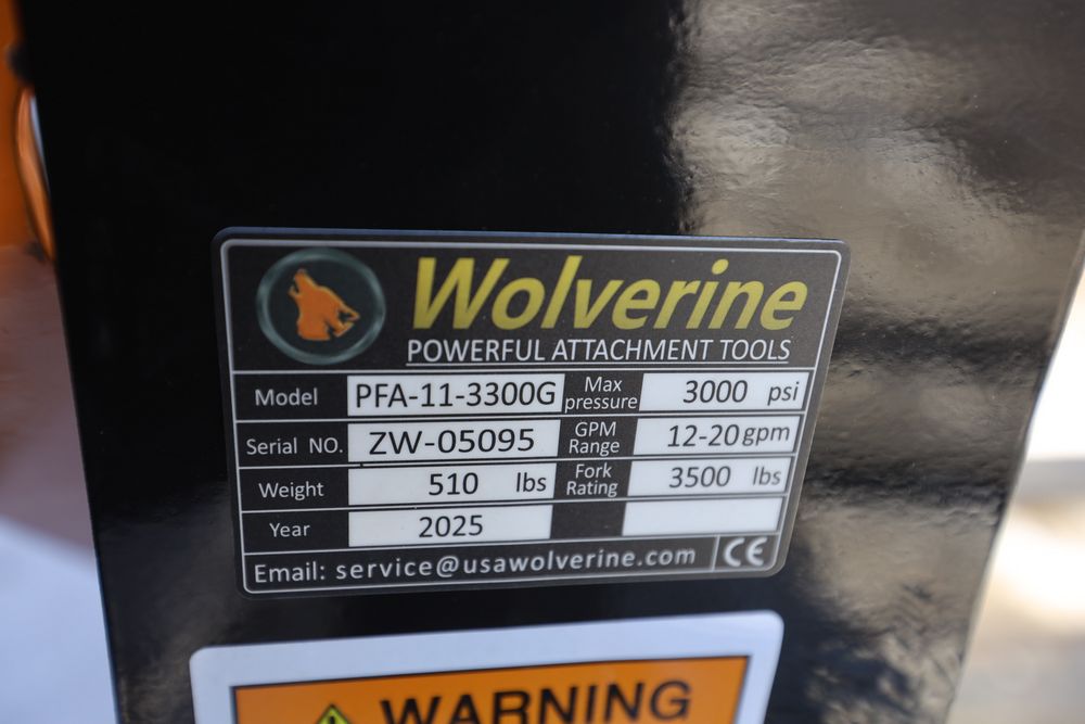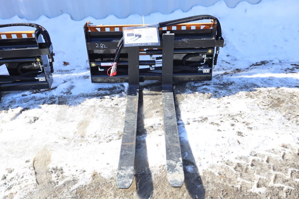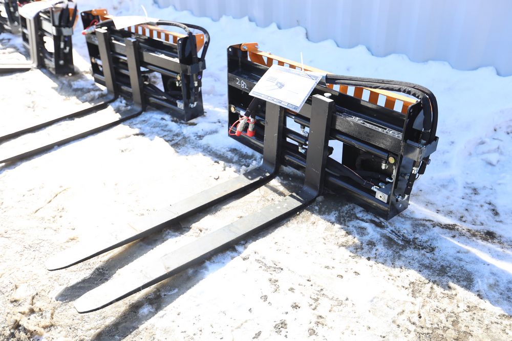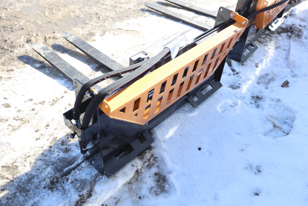 New 2026 Wolverine skid steer pallet fork attachment hydraulic adjustment, model PFA-11-3300G, 48" fork adjustment.