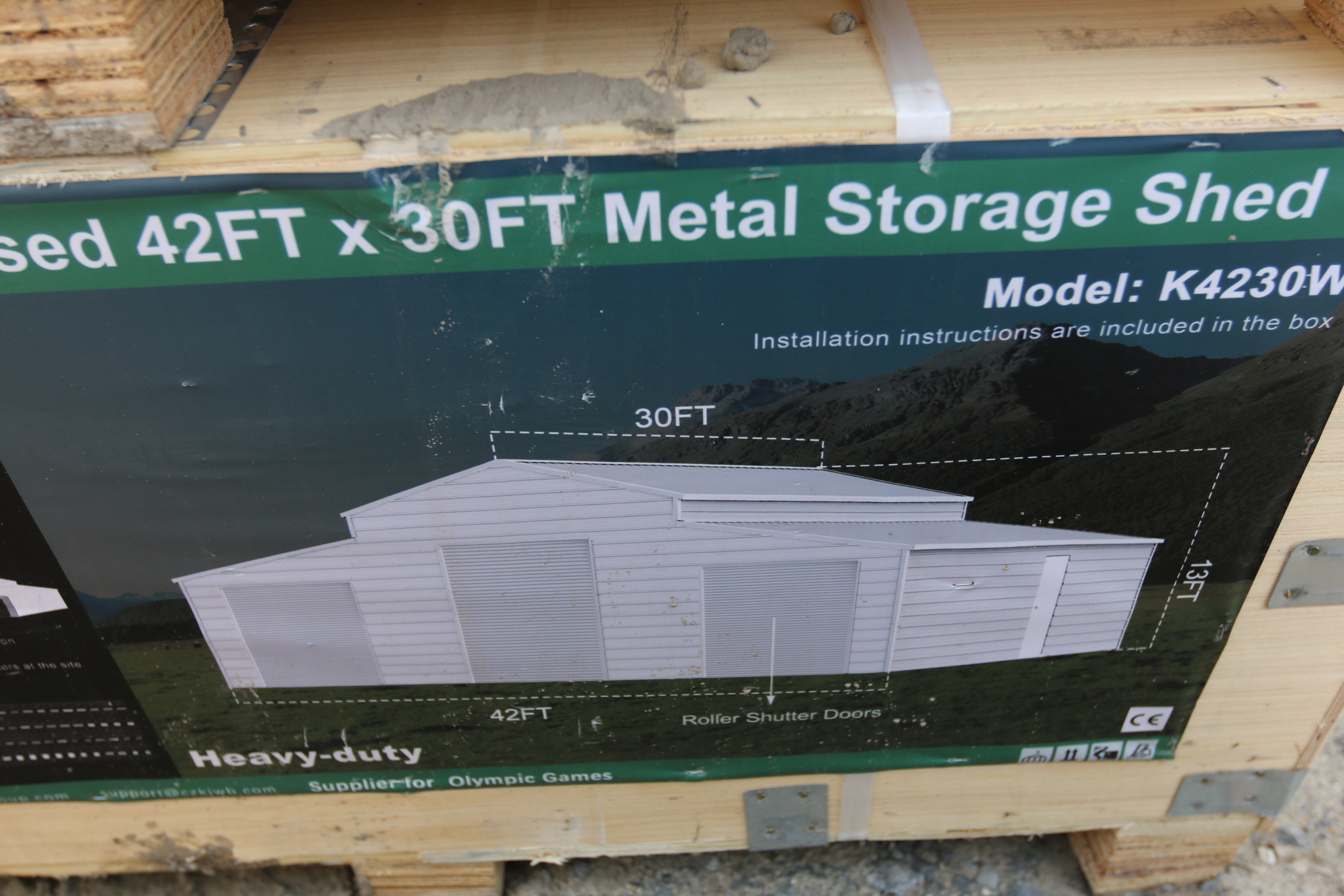 New 2026 Metal Storage Shed 42FT x 30FT Metal Storage Shed model K4230W, in wooden crate.