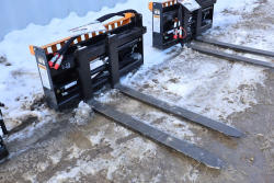 New 2026 Wolverine skid steer pallet fork attachment hydraulic adjustment, model PFA-11-3300G, 48" fork adjustment.