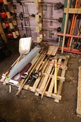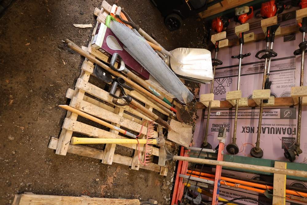 Assorted hand tools and materials including two metal shovels, one aluminum scoop shovel, one square shovel, one pickaxe, one rake, two long handled digging bars, two D handle shovels, one garden hoe, and a roll of wire mesh fencing, along with a box of Lake Annette Oak rigid core vinyl flooring with 12 mil wear layer.