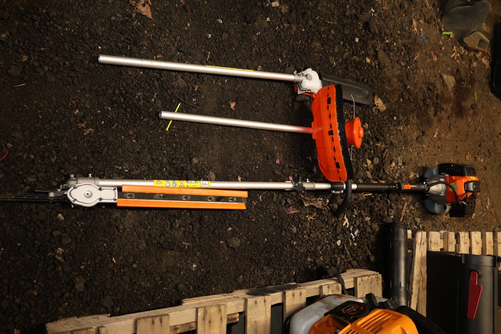 52cc gas powered multi tool power head with hedge trimmer attachment, string trimmer attachment, and pole saw chainsaw attachment with 12 inch bar and blade cover. Seller reports runs and operates as intended.