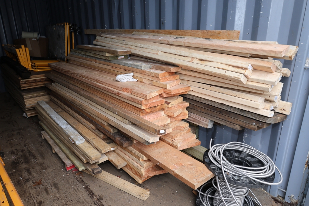 Assorted dimensional lumber including multiple 2 inch x 4 inch x 96 inch kiln dry boards labeled Irving, 2 inch x 4 inch x 10 foot boards labeled Weyerhaeuser, pressure treated 4 inch x 4 inch posts, and additional mixed length boards and planks stacked in a shipping container. Excludes other lots. Buyer must take all.