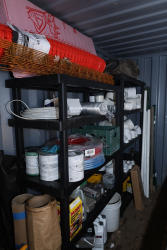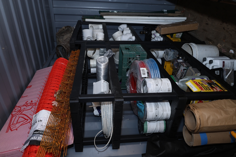 Contents of shelving unit including assorted PVC pipe fittings and elbows in multiple sizes, white PVC pipe sections, rolls of red and blue PEX tubing, roll of orange plastic safety fence, pink rigid foam insulation boards, welded wire mesh panels, Husky contractor clean up bags box, Grip Rite construction screws, Teks self drilling screws, assorted nails and fasteners in containers, Miracle Gro Shake n Feed plant food, Ortho weed and grass killer, additional lawn and garden chemicals in plastic jugs, paint cans, and miscellaneous hardware and plumbing supplies. Excludes other lots. Buyer must take all.