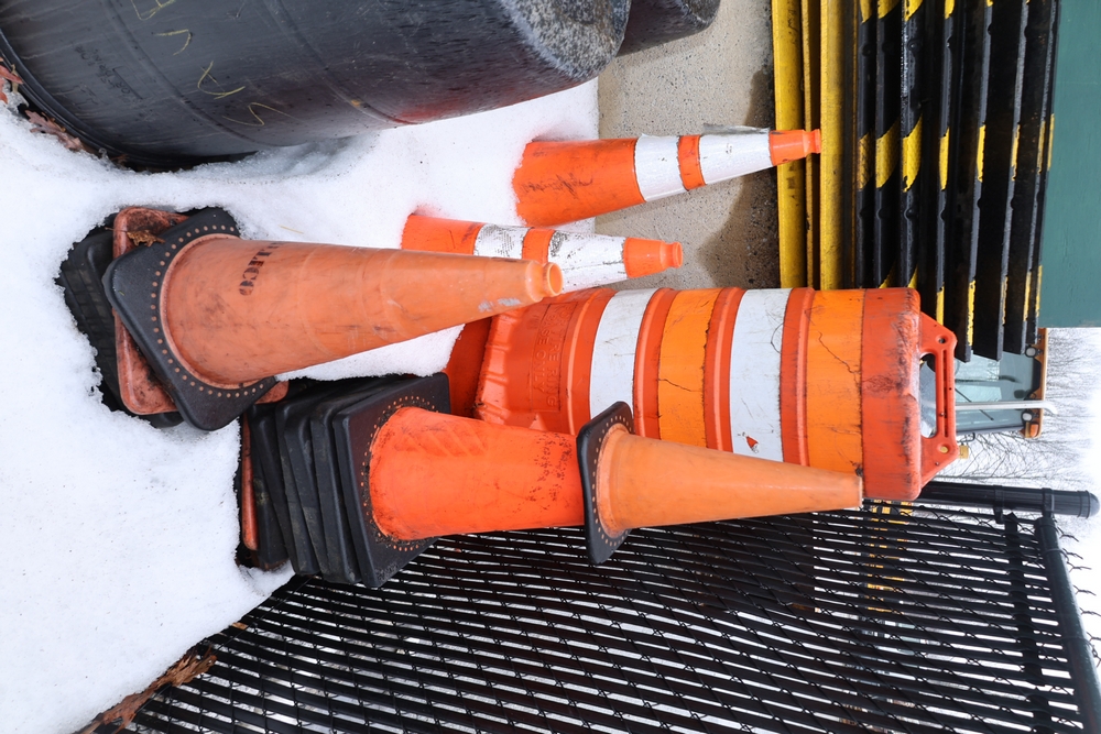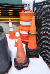 Assorted traffic control safety equipment including multiple reflective traffic cones with weighted rubber bases and one portable traffic barrel with carry handle and tire ring base.