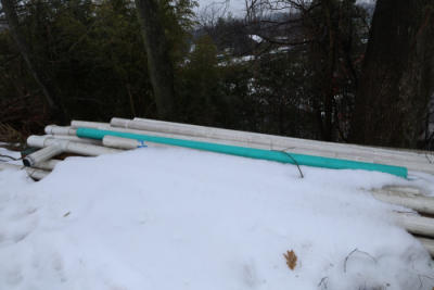 Assorted PVC pipes and fittings, including various lengths and diameters of Schedule 40 pipe. Brands include JM Eagle and Charlotte Pipe, with visible sizes such as 1 1/4" and 6". Some pieces have fittings or caps attached.