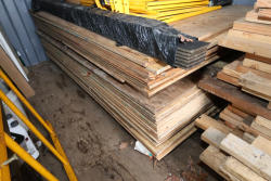 Assorted stacked plywood sheets of varying thicknesses and sizes, approximately 1/2 inch to 3/4 inch thick as shown by tape measure, including multiple full and partial sheets.
