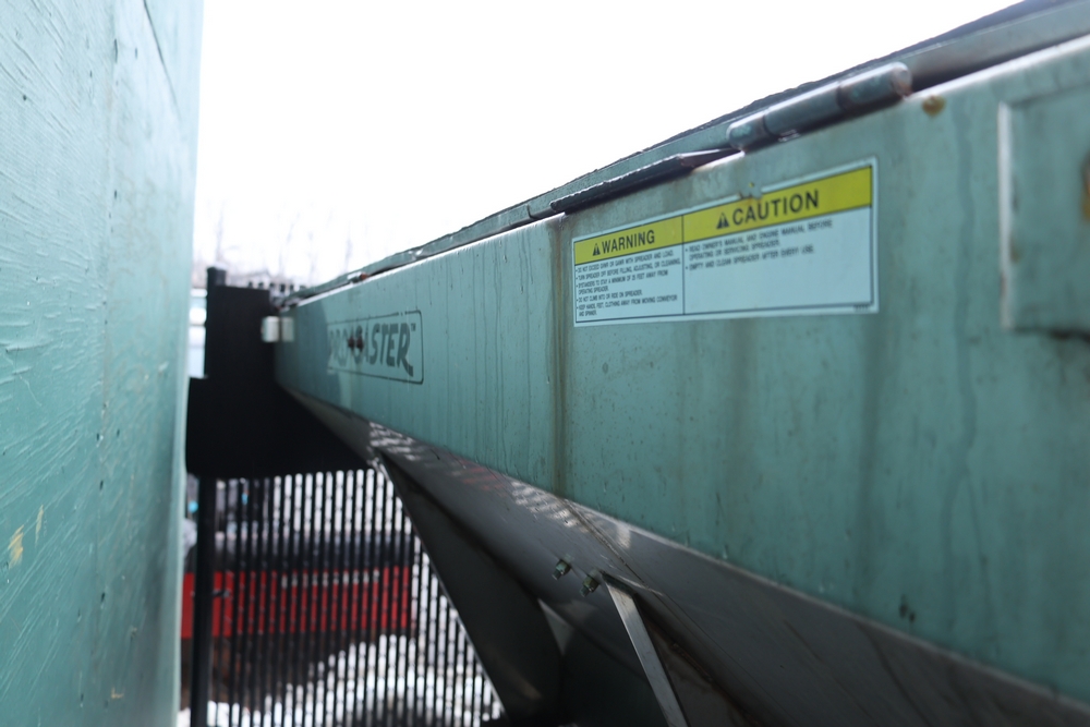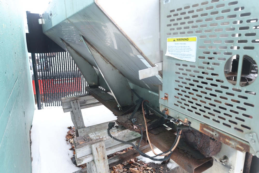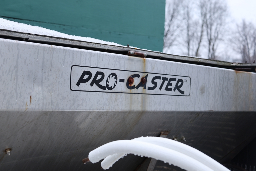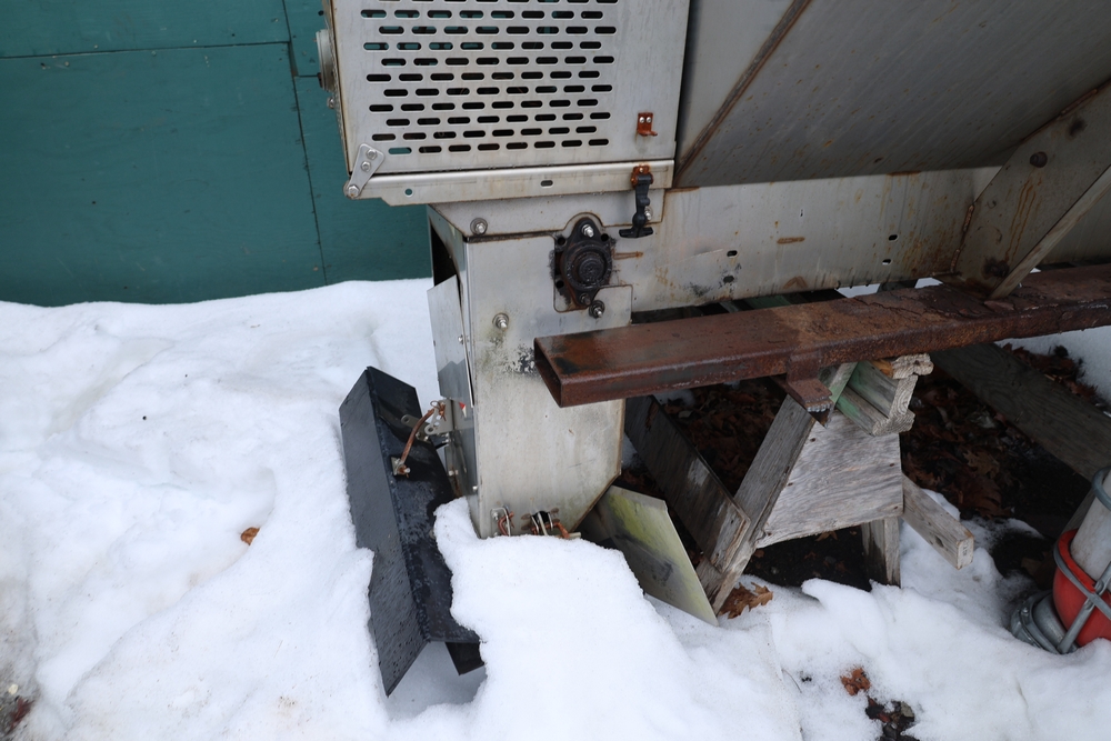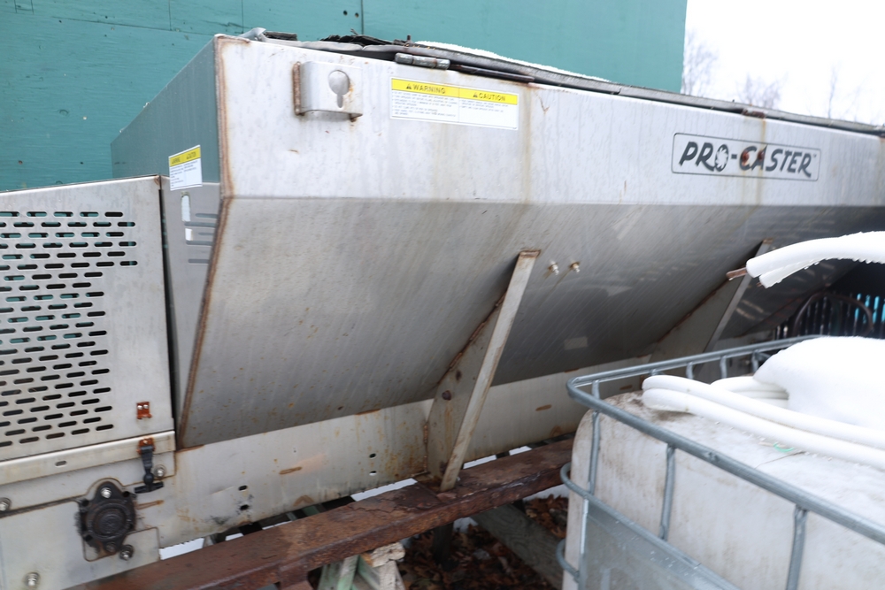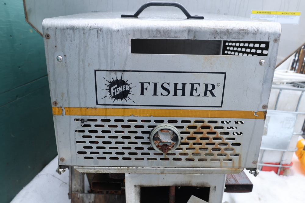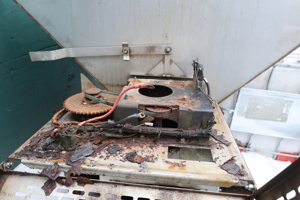 Fisher Pro-Caster industrial sander unit with large hopper-style body and enclosed housing, missing the motor. Seller reports: it has a new conveyor chain.