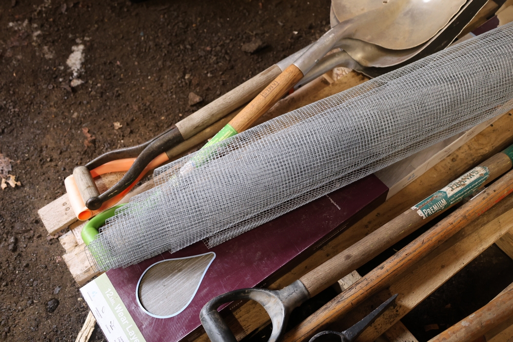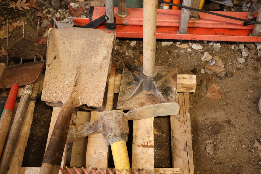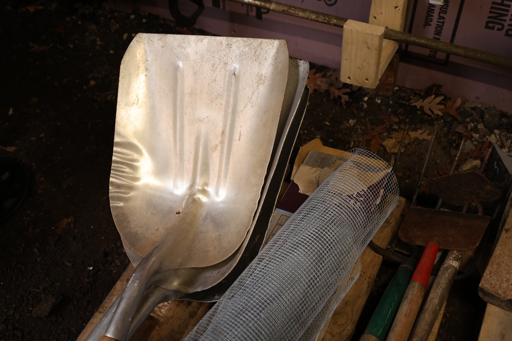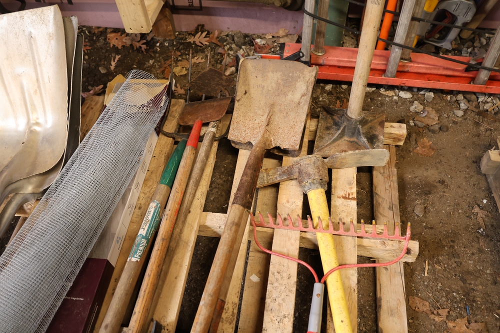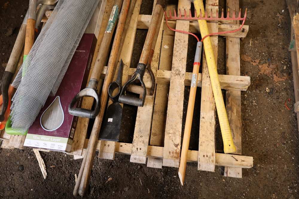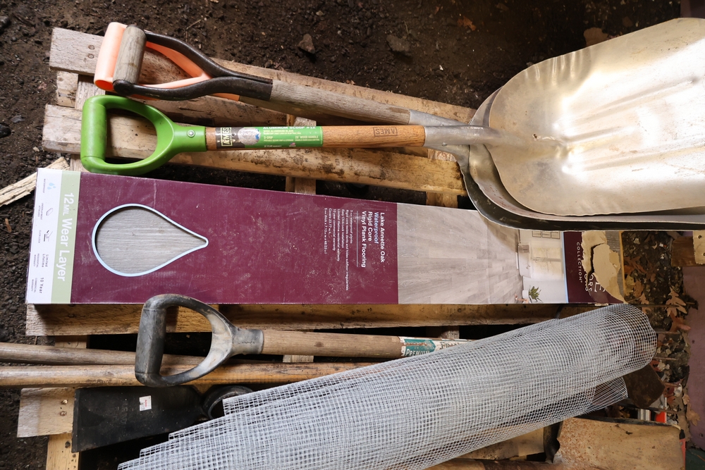 Assorted hand tools and materials including two metal shovels, one aluminum scoop shovel, one square shovel, one pickaxe, one rake, two long handled digging bars, two D handle shovels, one garden hoe, and a roll of wire mesh fencing, along with a box of Lake Annette Oak rigid core vinyl flooring with 12 mil wear layer.