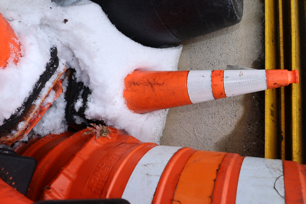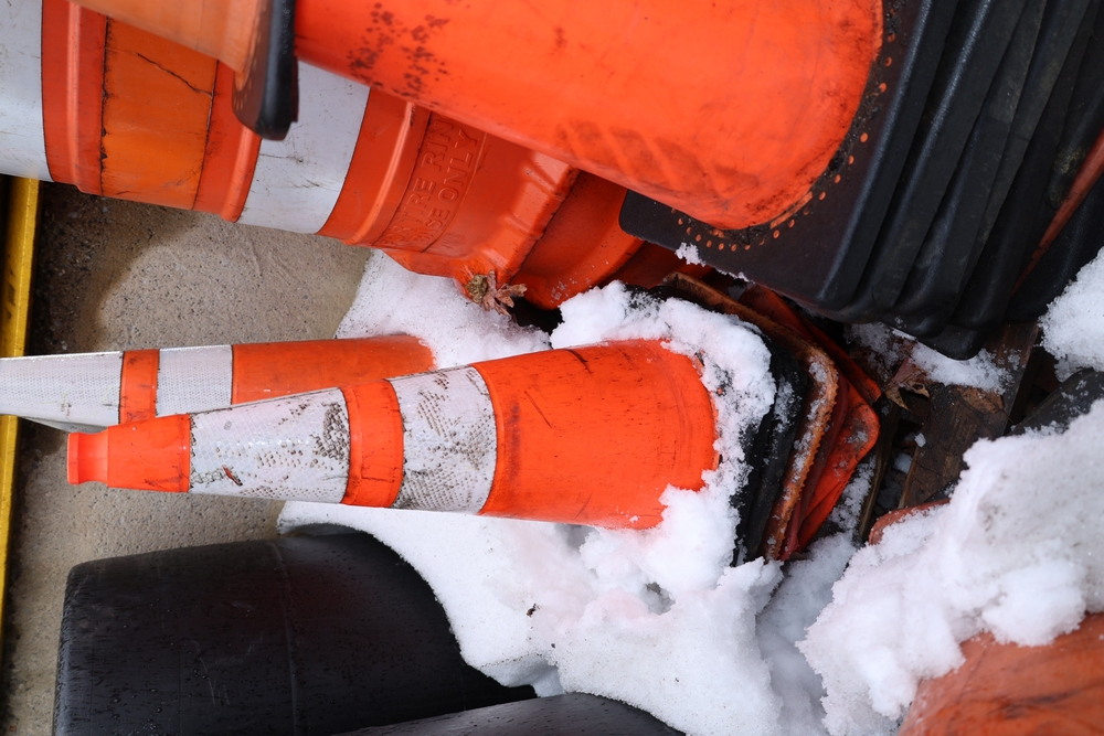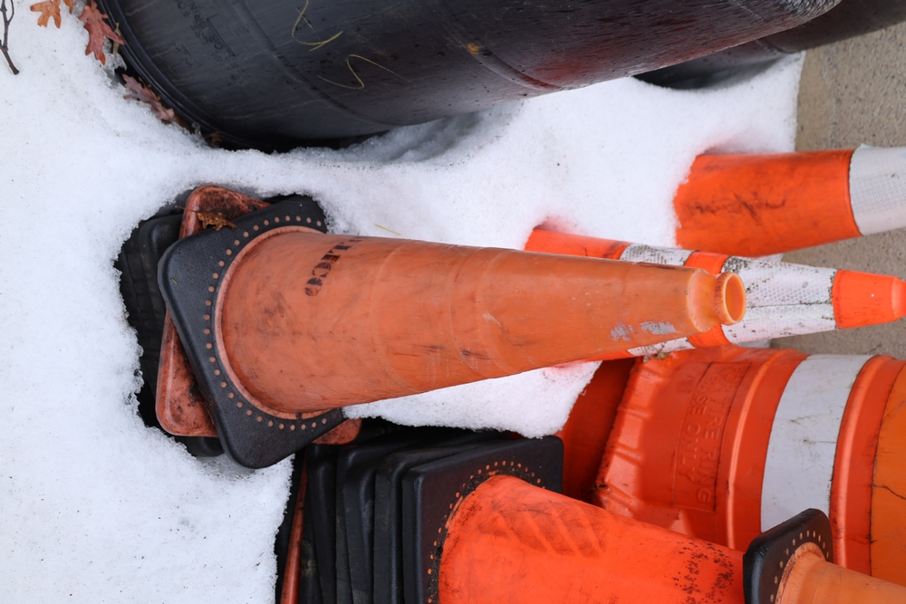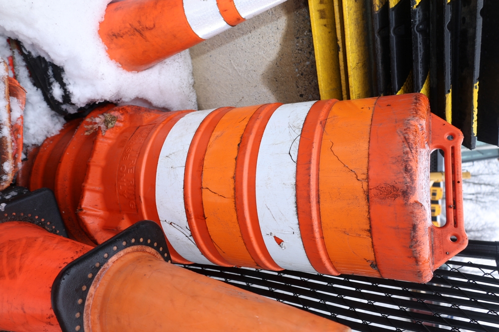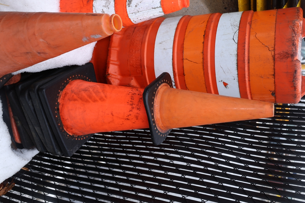 Assorted traffic control safety equipment including multiple reflective traffic cones with weighted rubber bases and one portable traffic barrel with carry handle and tire ring base.