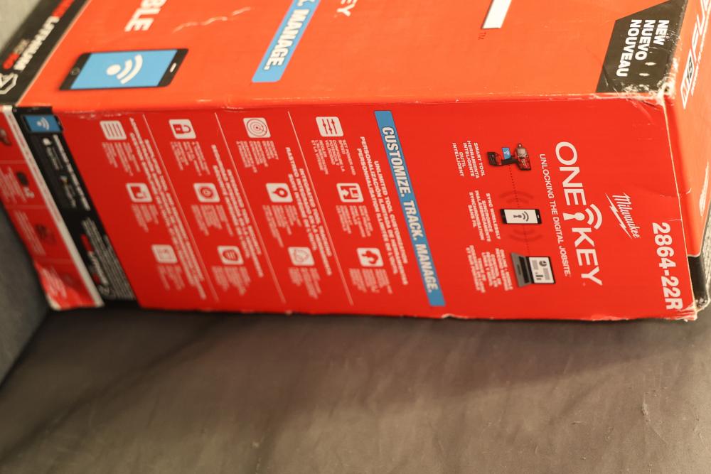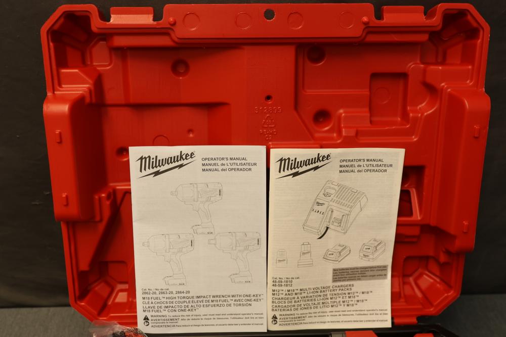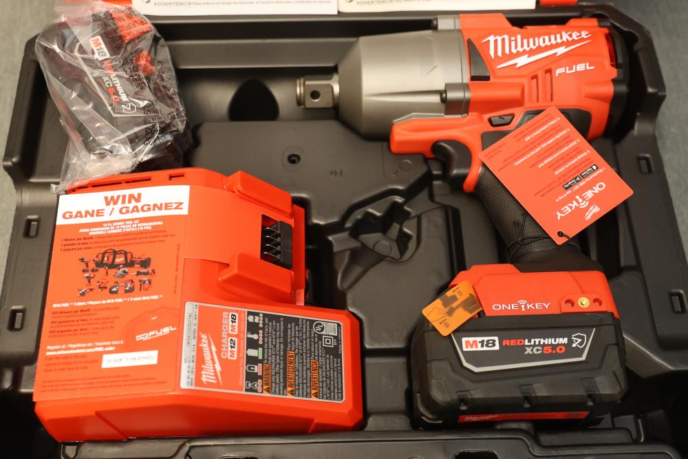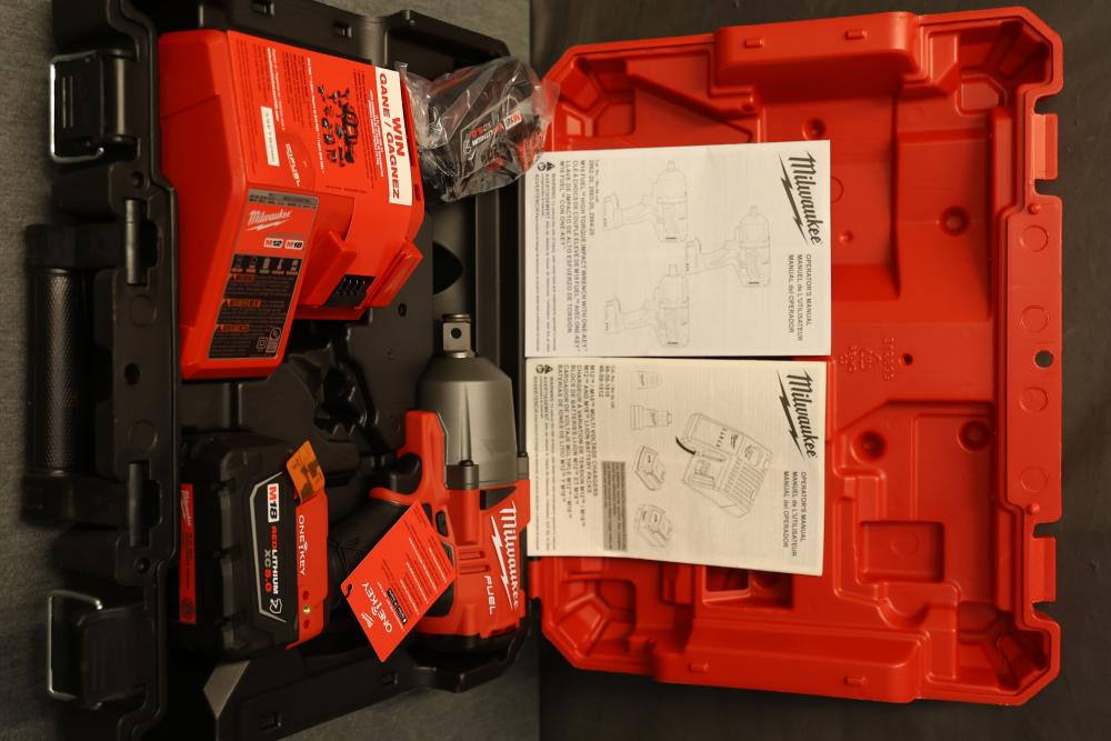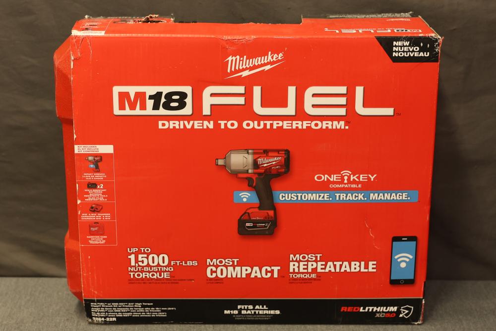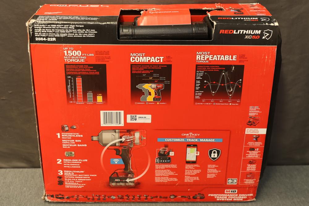 Milwaukee 2864-22R M18 Fuel One-Key Compatibility High Torque Impact Wrench with 3/4 Inch Friction Ring Kit. Includes the M18 Fuel impact wrench, charger, two RedLithium XC 5.0 batteries, and carrying case. Features 1500 ft-lbs of torque, One-Key technology for tool customization and tracking, and a compact design. The carrying case has a crack visible in the exterior. Pickup only.