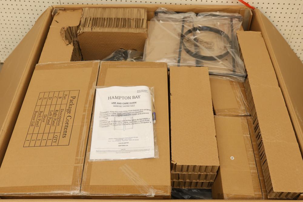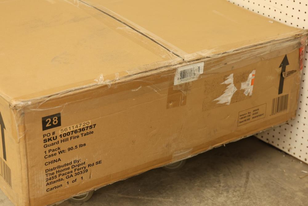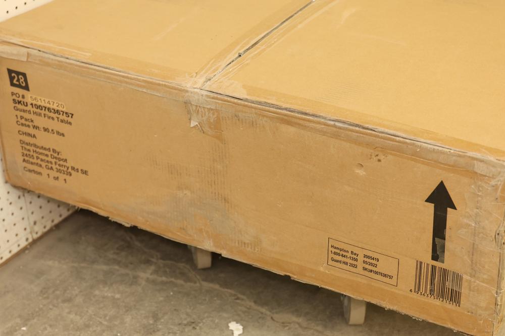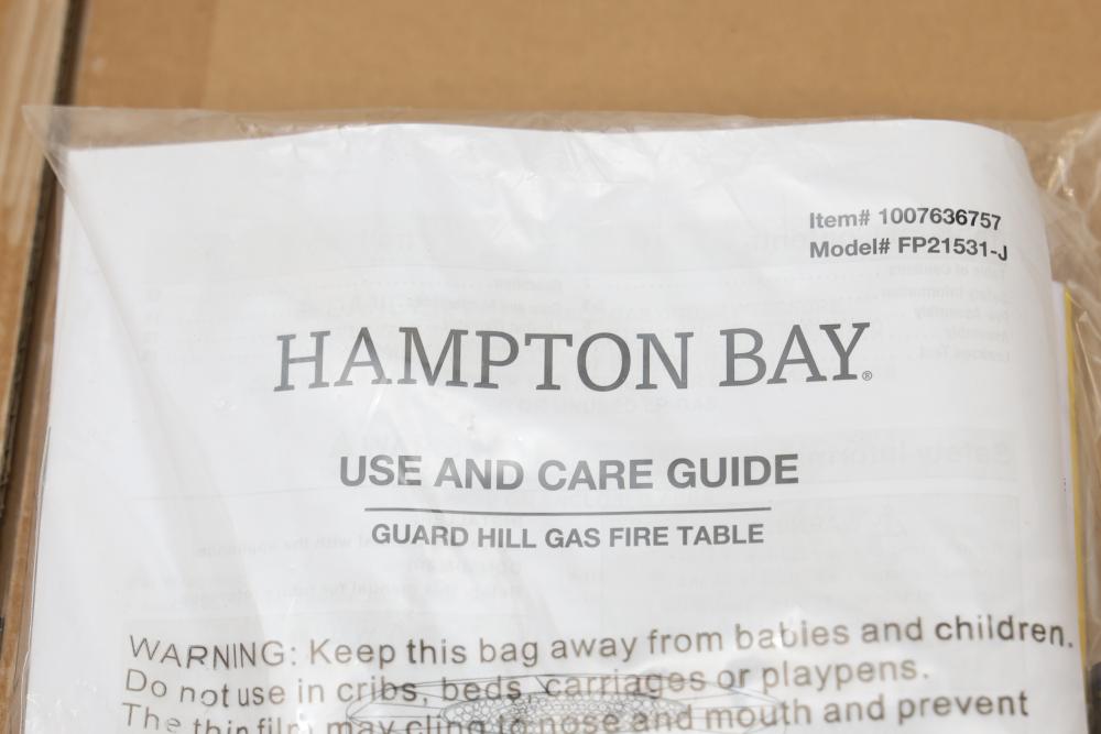 Hampton Bay FP21531-J 36 Inch Wide 50,000 BTU Guard Hill LP Gas Fire Table. Features a sturdy metal construction, black finish, and includes all necessary components for setup. New in original packaging. Manufactured by Hampton Bay and distributed by The Home Depot. Item weights 90.5 lbs. Pickup only.