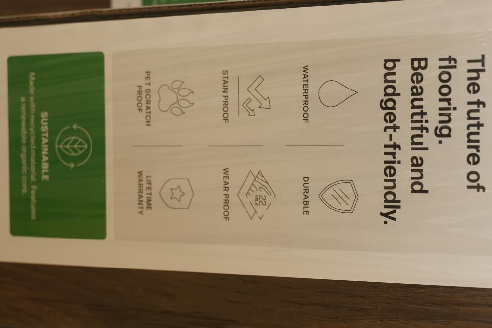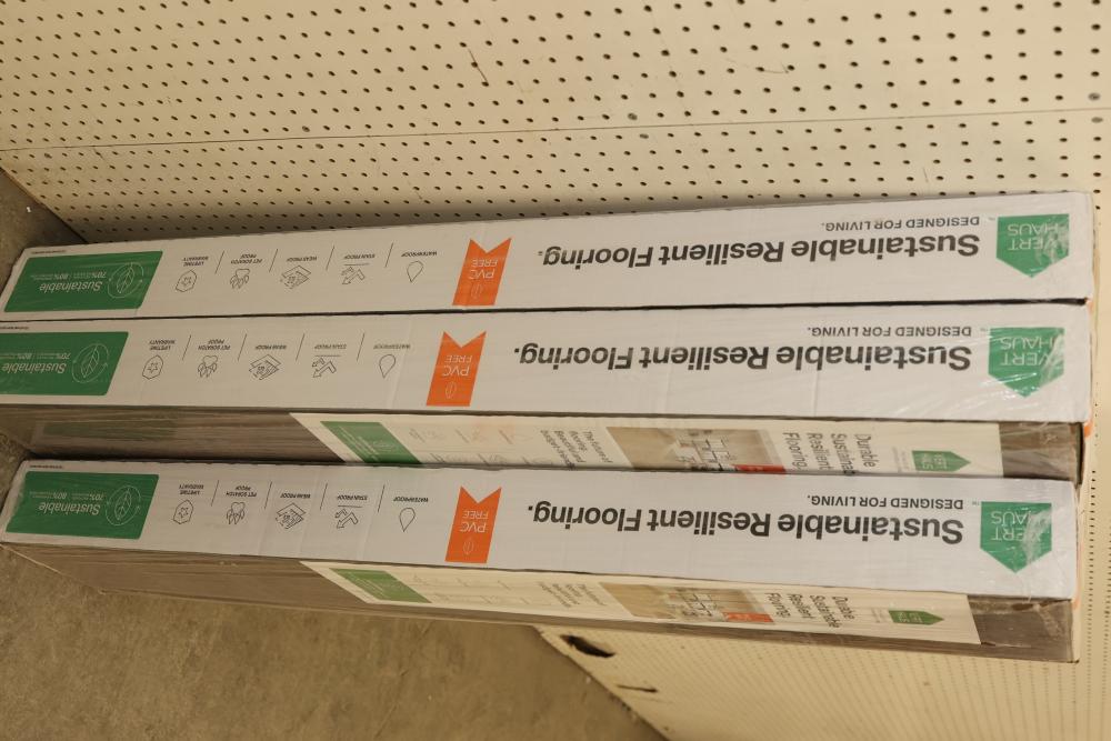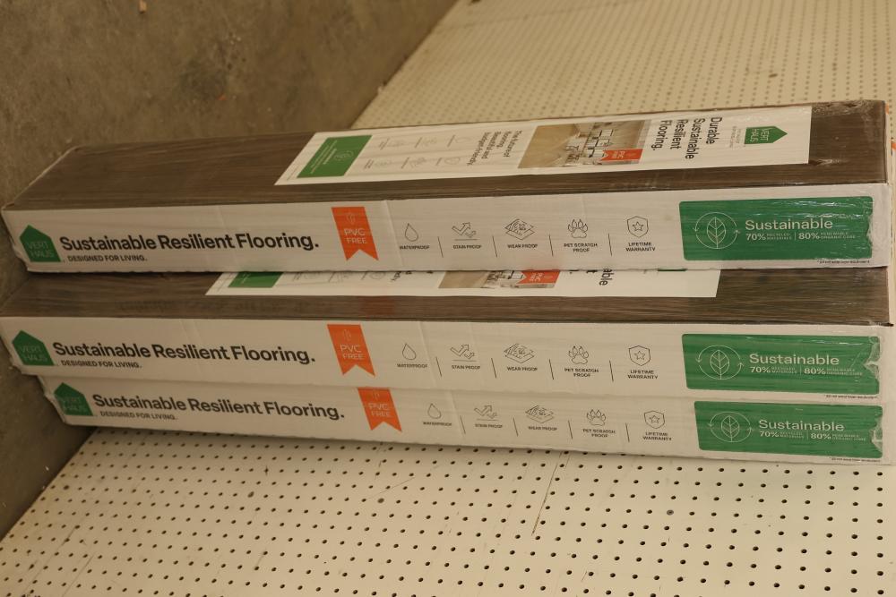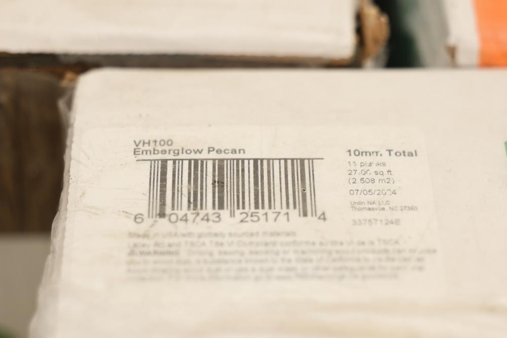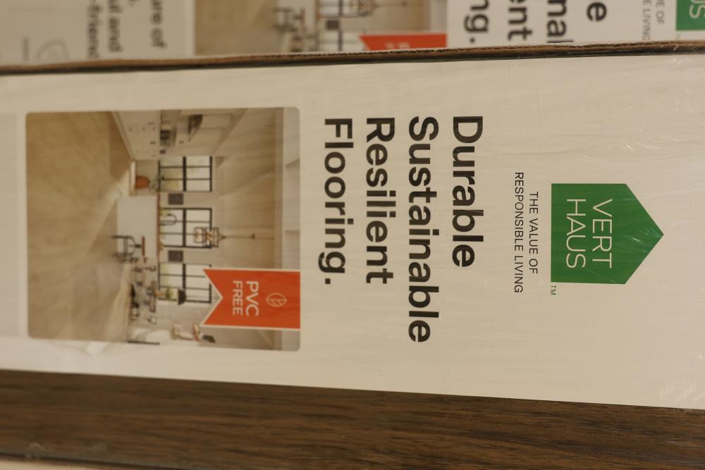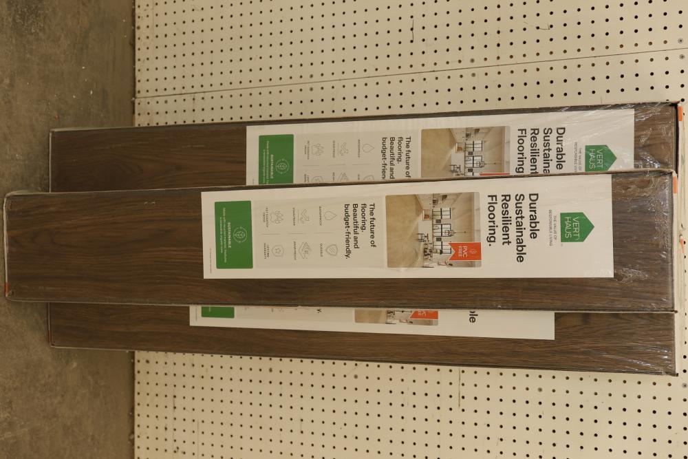 Vert Haus VH100 Emberglow Pecan 10 mm Total, 7.4 Inch x 47.2 Inch Resilient Flooring, 27 square feet per case, with a total of 5 cases. Features include being waterproof, durable, stain-proof, wear-proof, pet scratch-proof, and supported by a lifetime warranty. Sustainable construction with recycled materials. Pickup only.