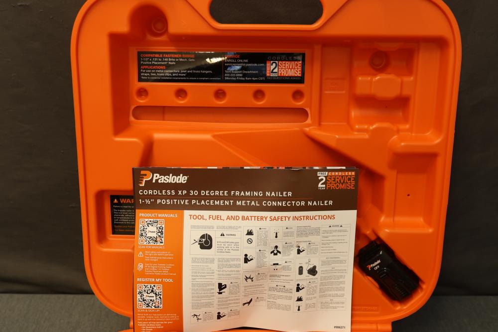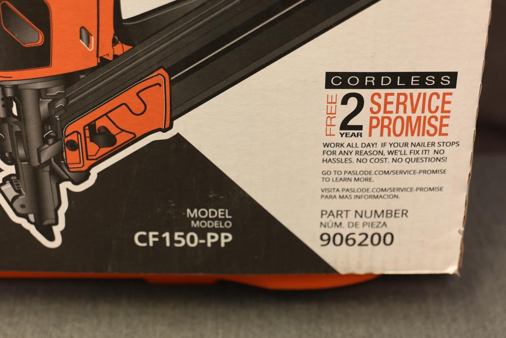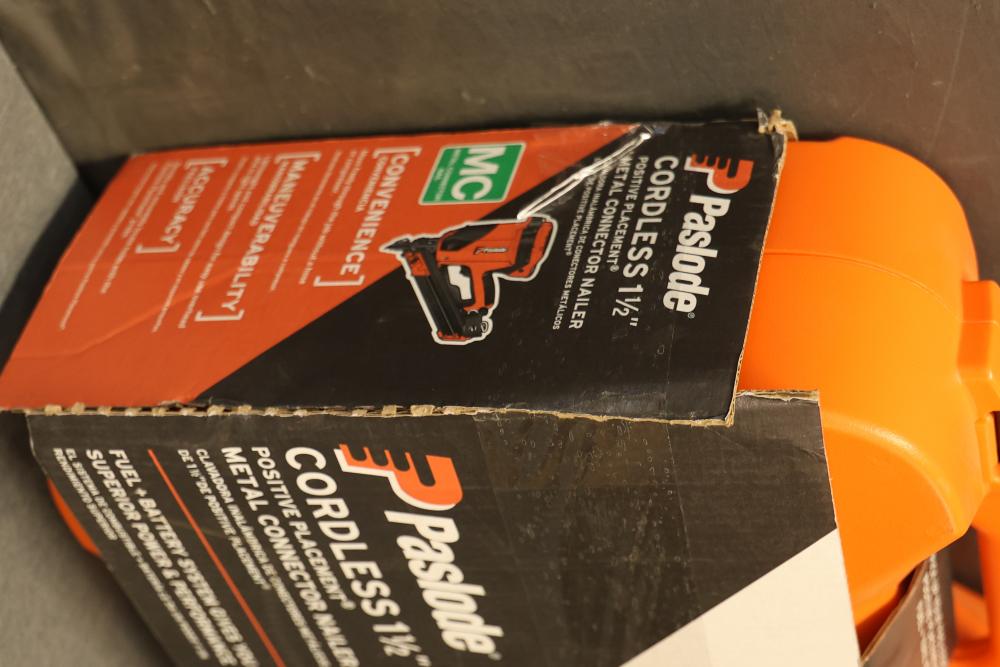 Paslode CF150-PP 1.5 Inch Cordless Metal Connector Nailer. Features a cordless design for Positive Placement of metal connectors. Includes original carrying case, rechargeable lithium-ion battery, and charger. Missing fuel cell and drive nails. Pickup only.