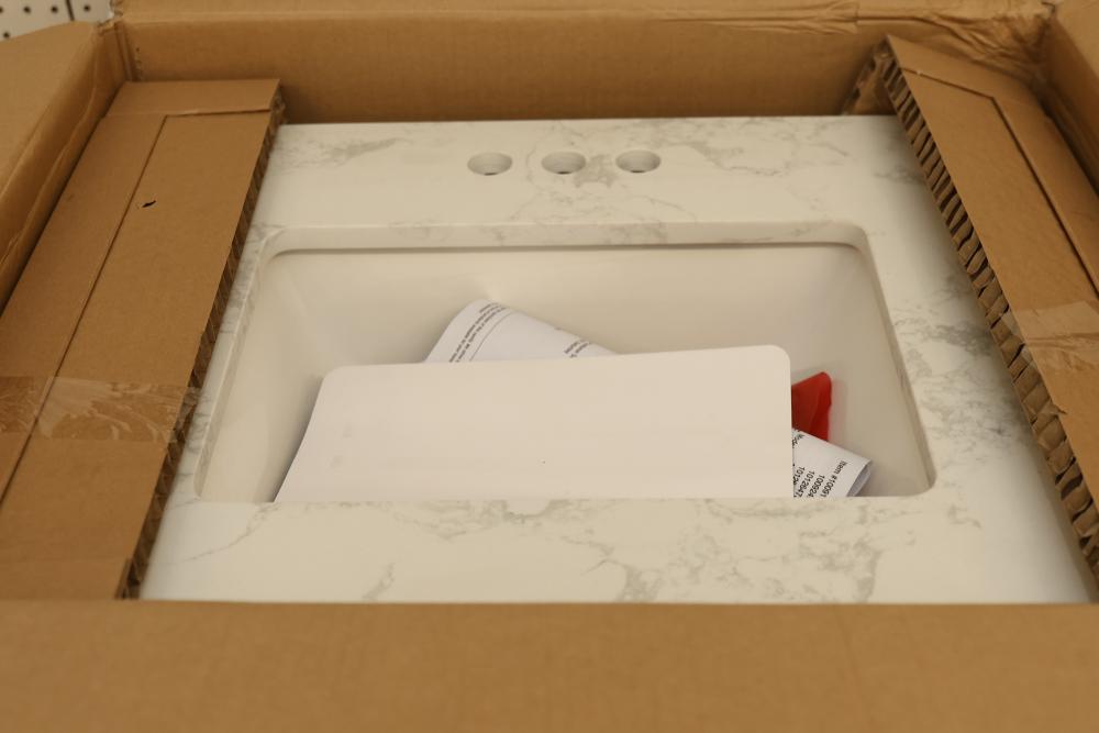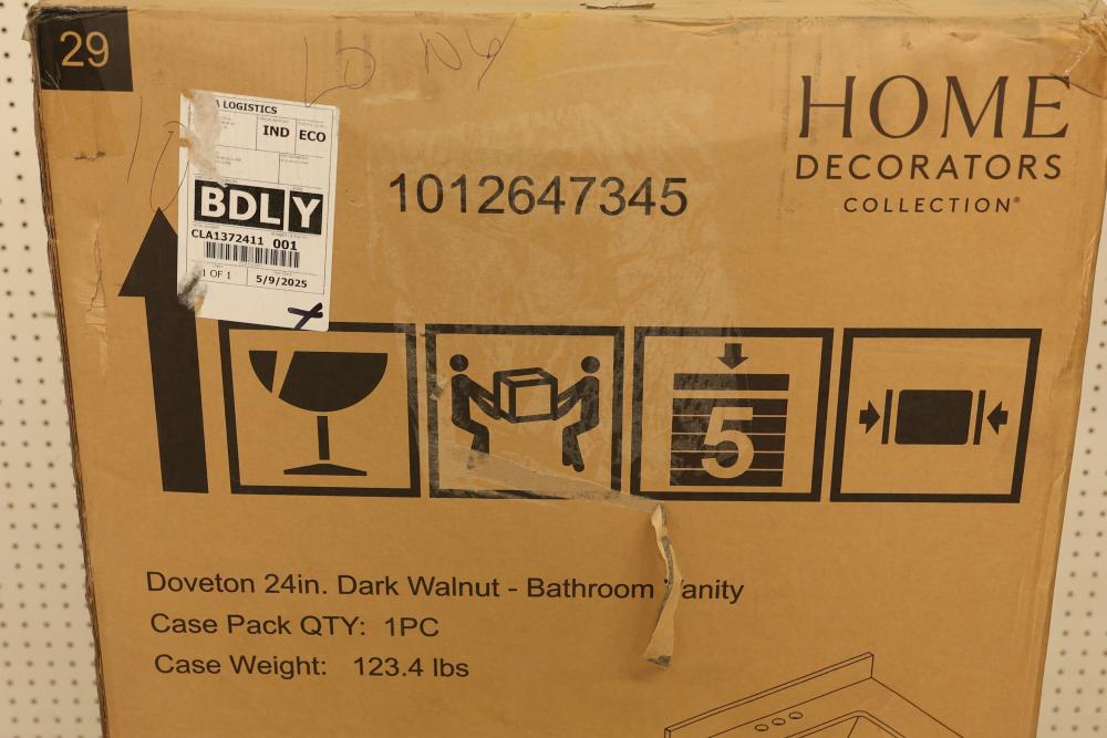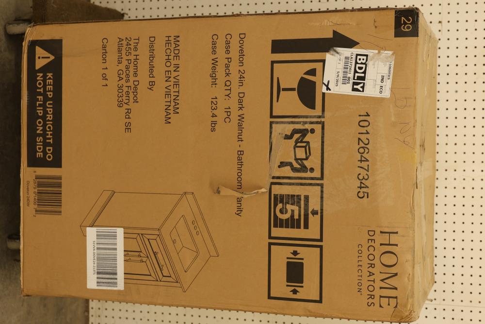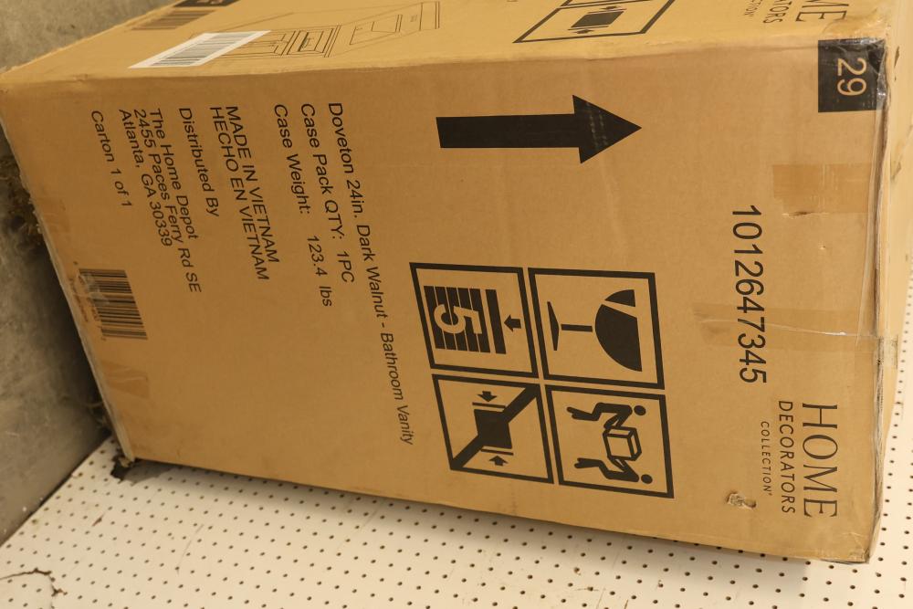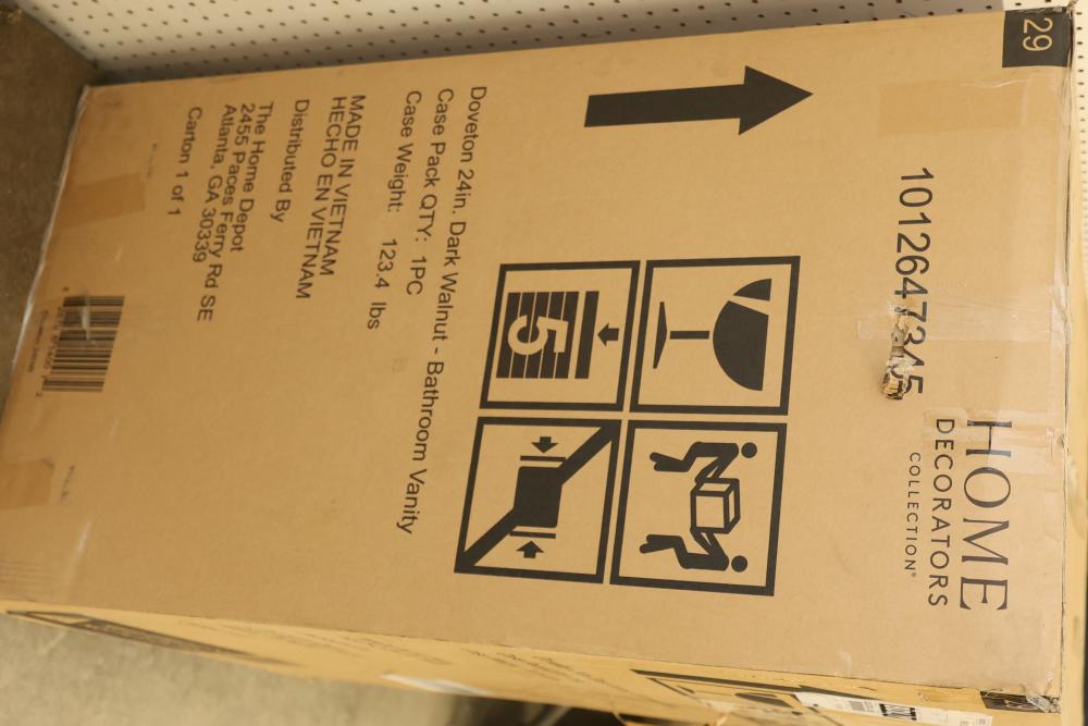 Home Decorators 24-Inch Dark Walnut Bathroom Vanity with a marble top and a pre-installed sink. Features include gold-tone hardware, a single cabinet with storage space, and a compact yet functional design. Item is in original packaging and has a listed weight of 123.4 lbs. Pickup only.