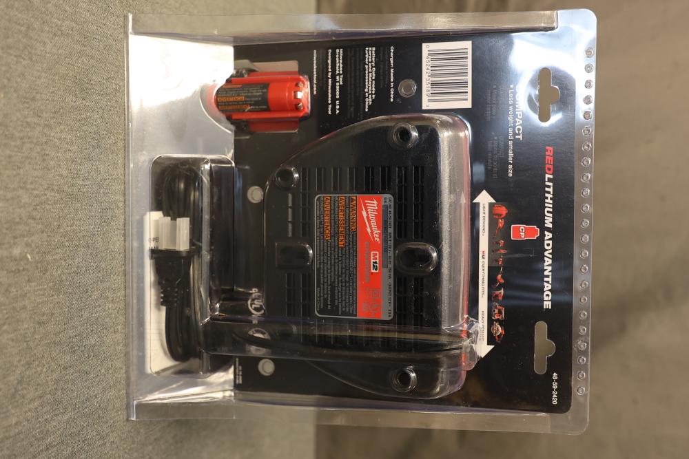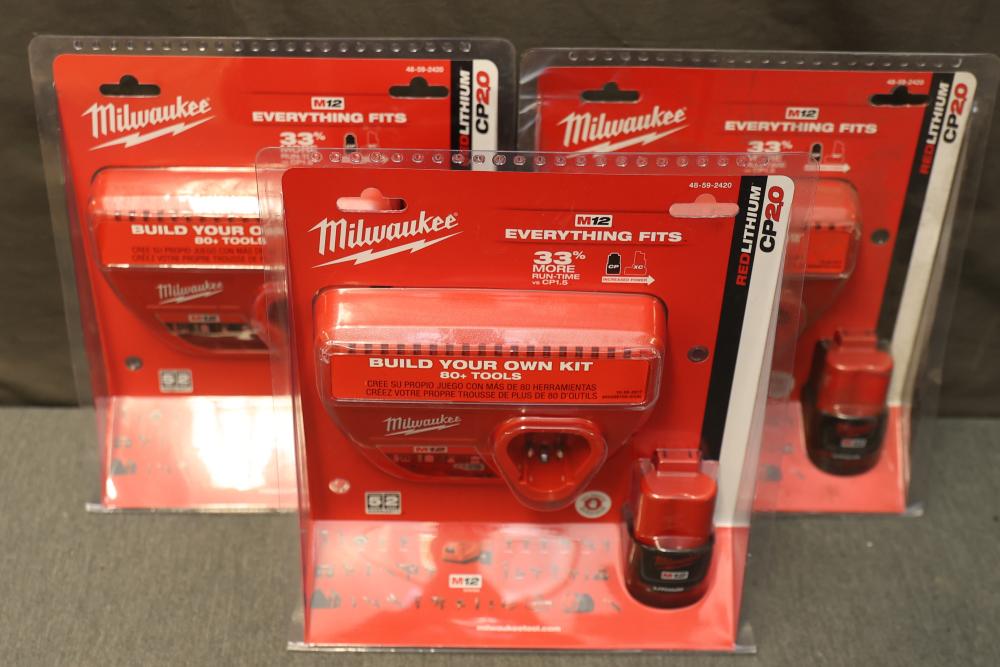 Milwaukee 48-59-2420 M12 12-V Lithium-Ion Compact Battery 2.0 Ah and Charger Starter Kit, Quantity of 3. Includes three M12 RedLithium 2.0 Ah batteries and three compatible compact chargers. Designed for M12 tools, offering extended runtime and reliability. All items are in original packaging and include user manuals. Pickup only.