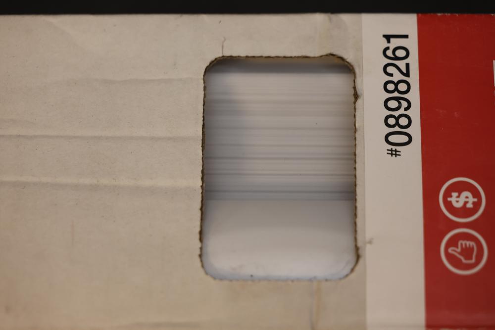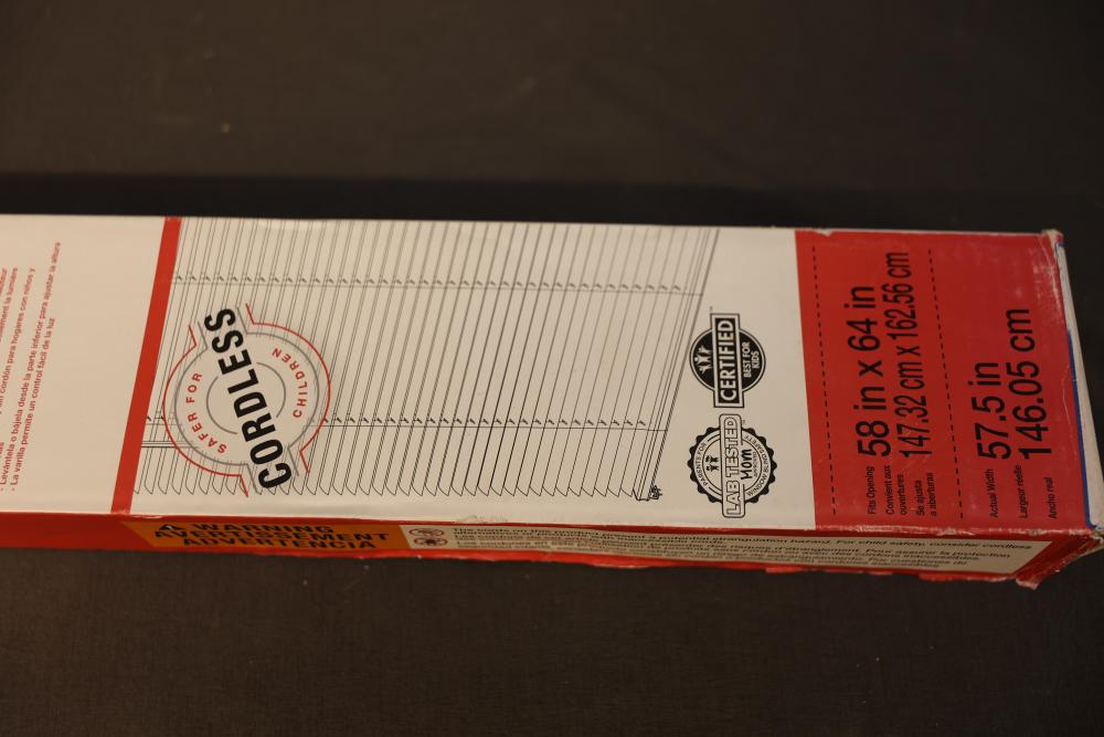 Project Source 0898261 Cordless Vinyl Mini Blind, 58 in x 64 in, White. Designed for light filtering, this blind comes with a cordless feature for safety and convenience. There are two packages in total. Dimensions are 58 inches wide and 64 inches long, with an actual width of 57.5 inches. Pickup only.