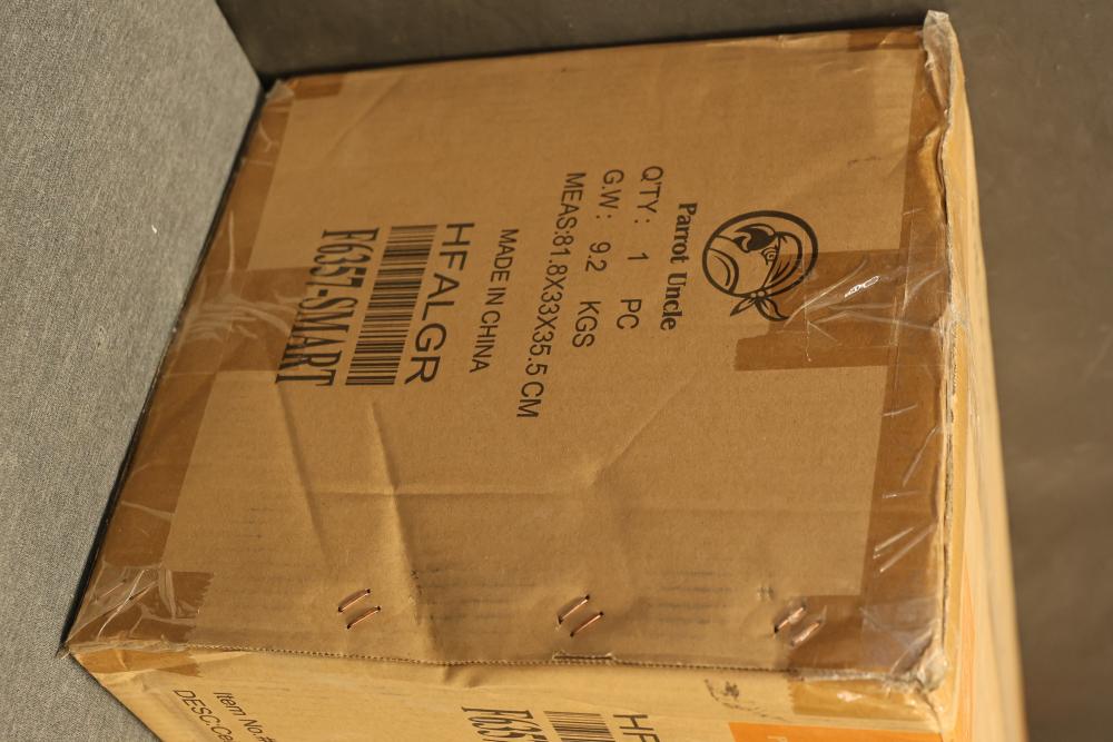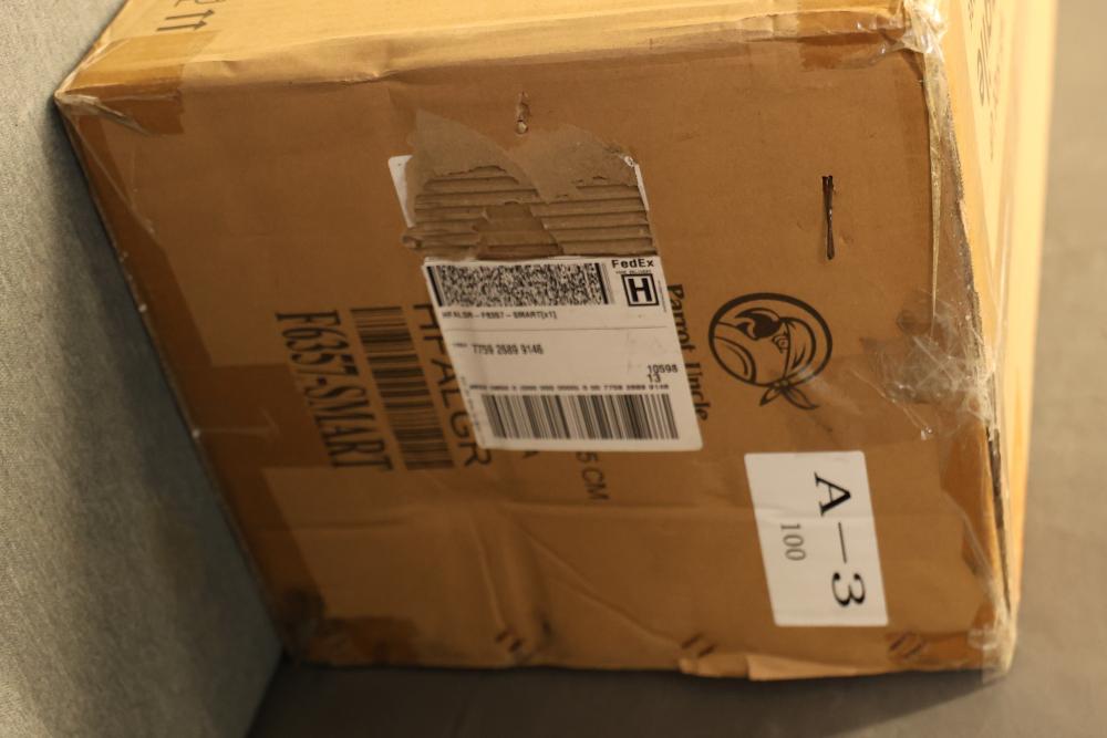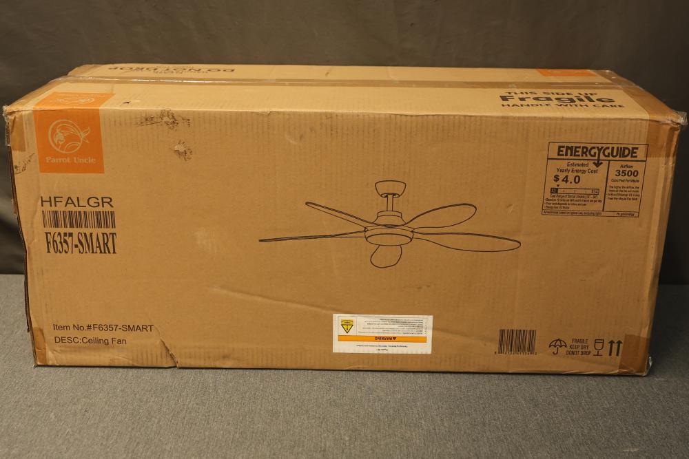 Parrot Uncle F6357-SMART 52 Inch Punjab Smart Fan with LED Light. Includes components as shown in packaging. The fan features five blades and an integrated LED light. Dimensions, specifications, and weight referenced on the packaging are provided for reference. New in original packaging. Pickup only.
