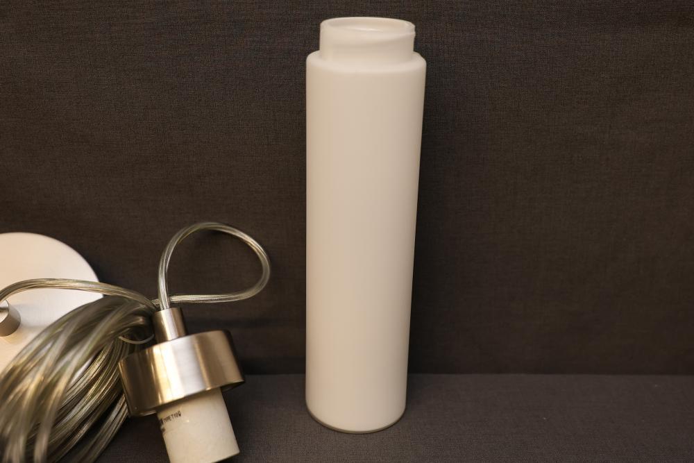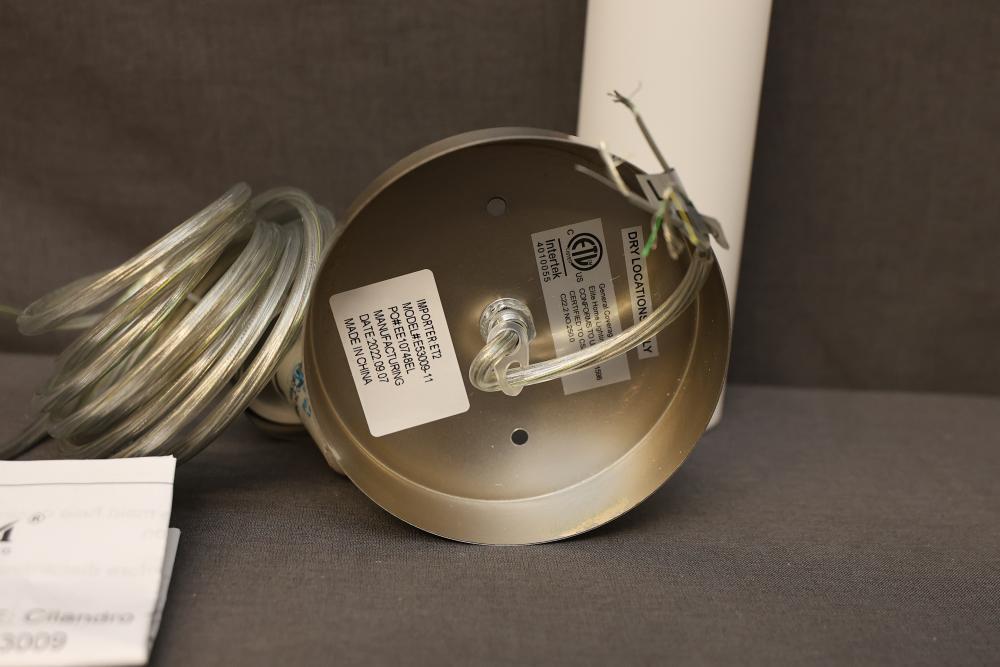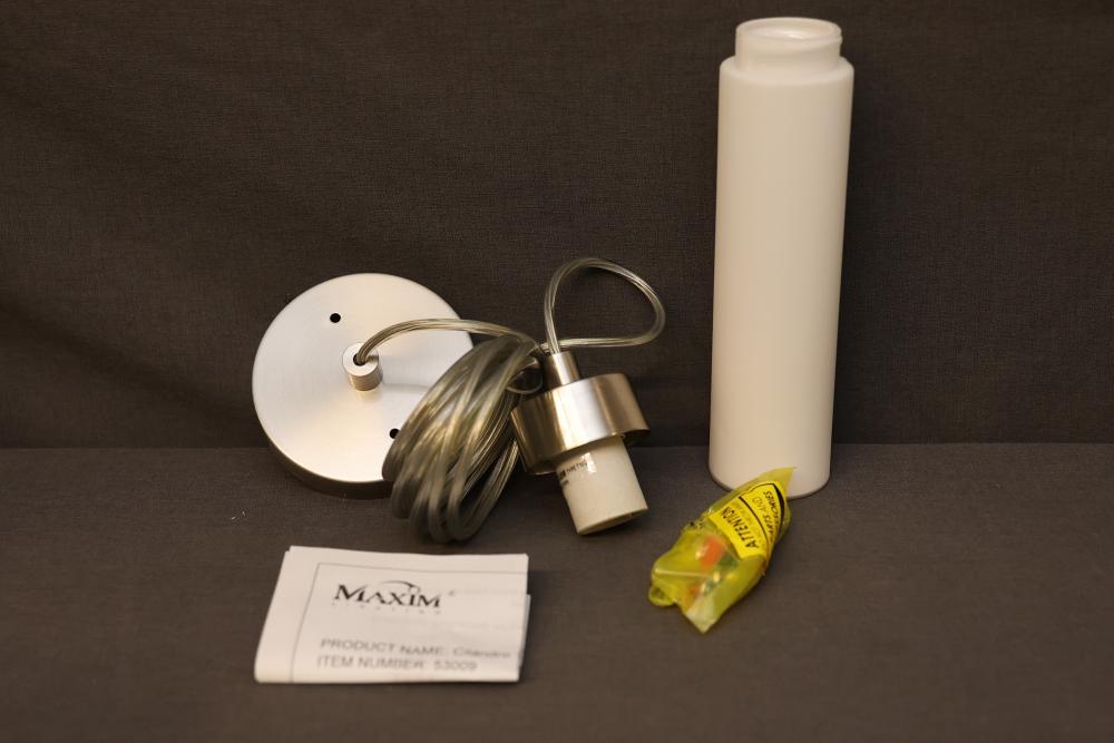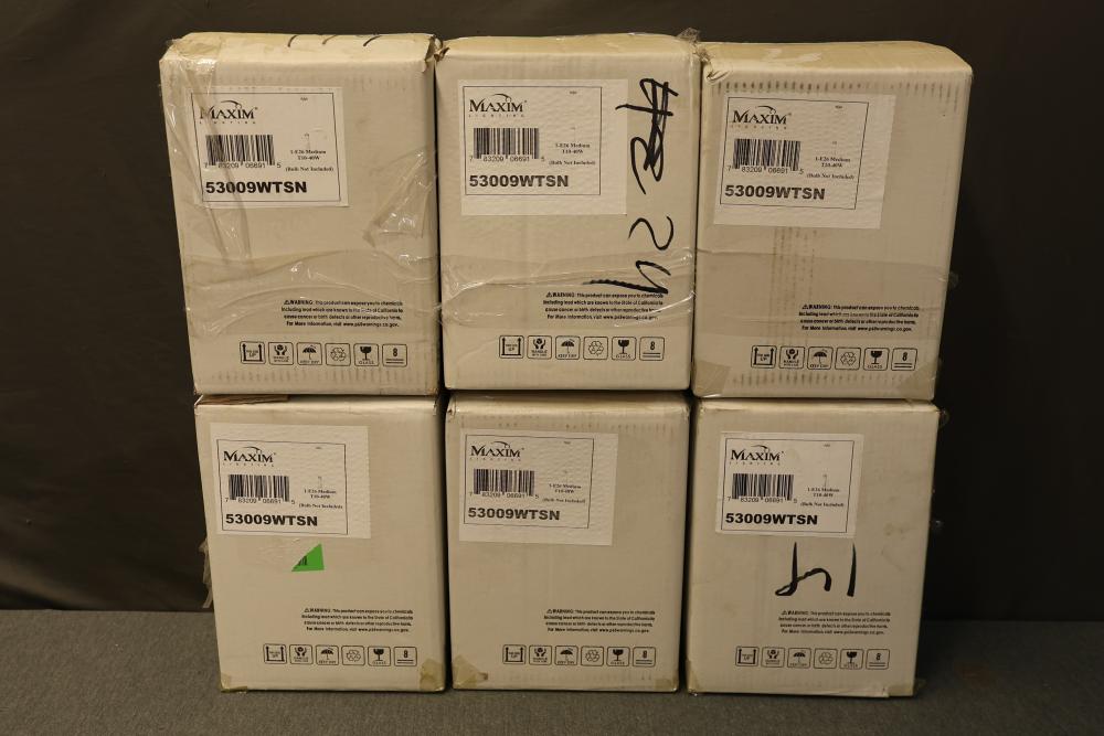 Maxim Lighting Pendant Light Model 53009WTSN with a satin nickel finish. Includes six boxes, each containing a pendant light designed for use with a T10-40W bulb (not included). Features a cylindrical light shade, cord, and mounting hardware. Packaging and product information are intact. Pickup only.