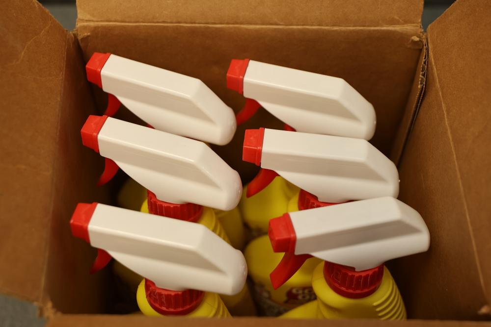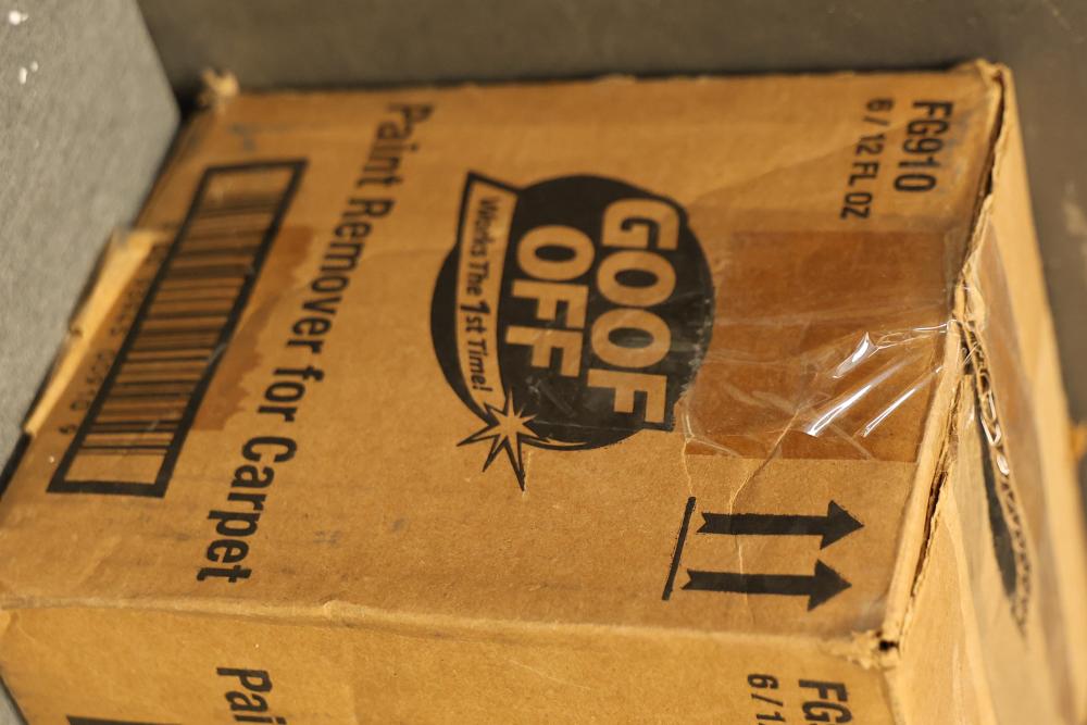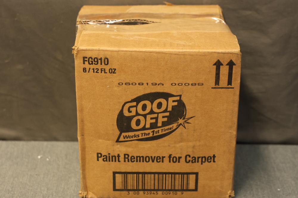 Goof-Off FG910 Paint Remover for Carpet, Full Case of 6 12 fl. oz Bottles. Includes six bottles with spray nozzles designed for removing dried paint from carpets while being safe for washable carpets. The unopened case is intact, and the product packaging is clearly labeled. Pickup only.