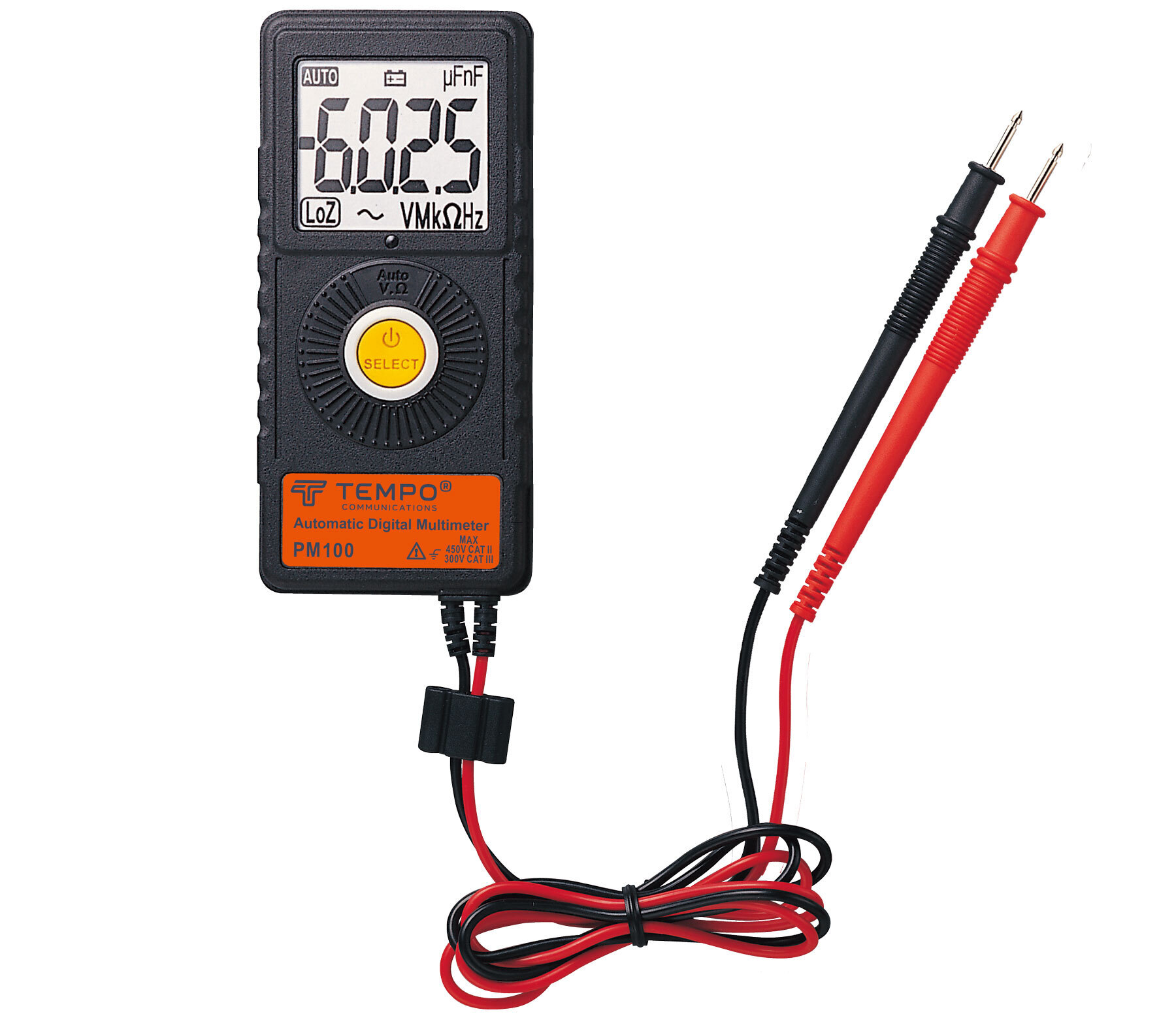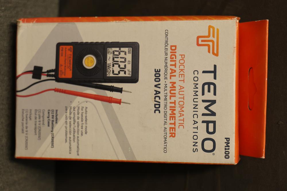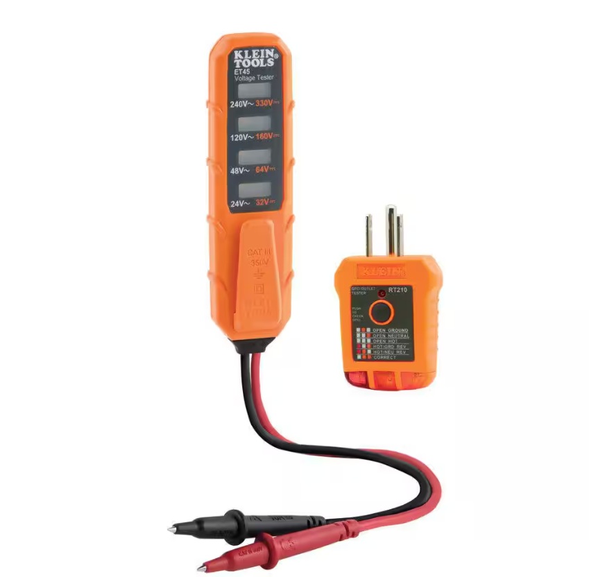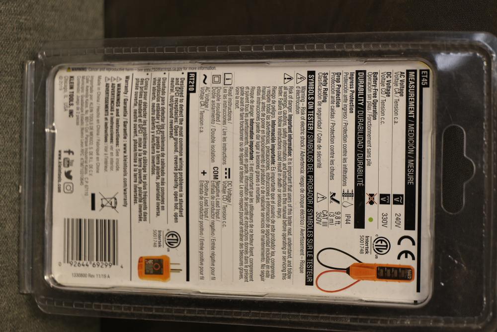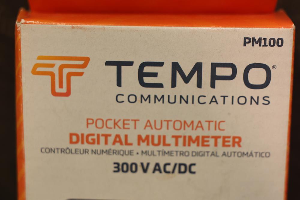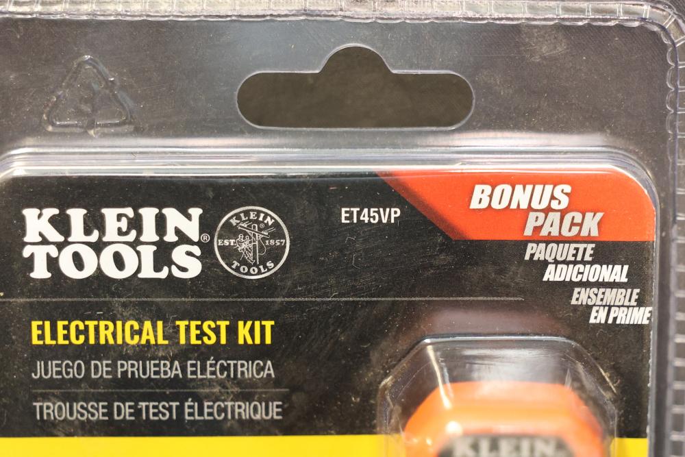 Klein Tools ET45VP Electrical Test Kit and Tempo Communications PM100 Pocket Automatic Digital Multimeter. The ET45VP kit measures AC voltage up to 240V and includes a receptacle tester for diagnostic purposes, featuring durable construction. The PM100 Pocket Automatic Digital Multimeter from Tempo Communications measures AC/DC voltage up to 300V, includes automatic and manual mode selection, and features a pocket-sized design with a large clear display. Both items are in their original packaging and appear unused. Pickup only.