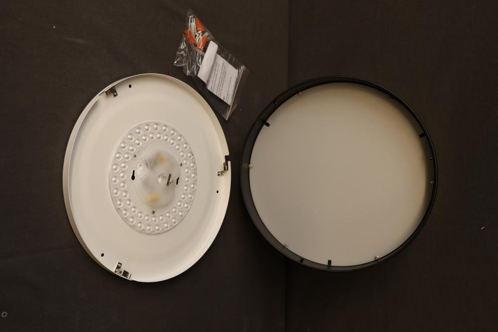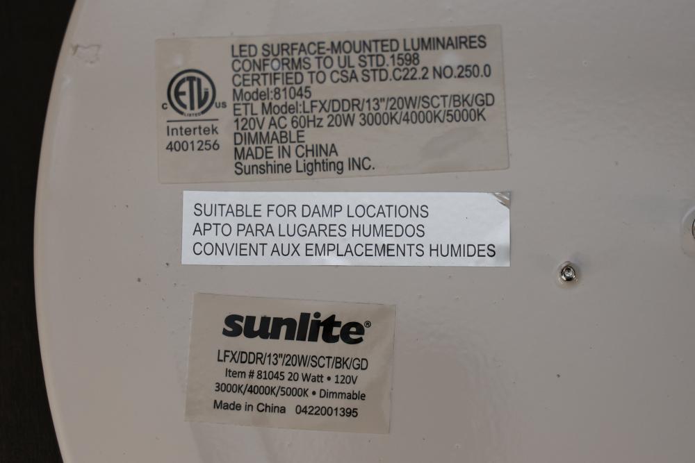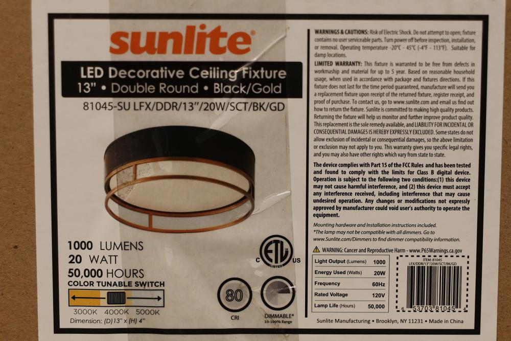Sunlite 81045-SU LED Decorative Ceiling Fixture, 13 Inches, Black and Gold. Features 1000 lumens of brightness, consumes 20 watts of power, and includes a color tunable switch offering 3000K, 4000K, or 5000K color temperature options. ETL certified, dimmable, suitable for damp locations, and includes mounting hardware. Pickup only.