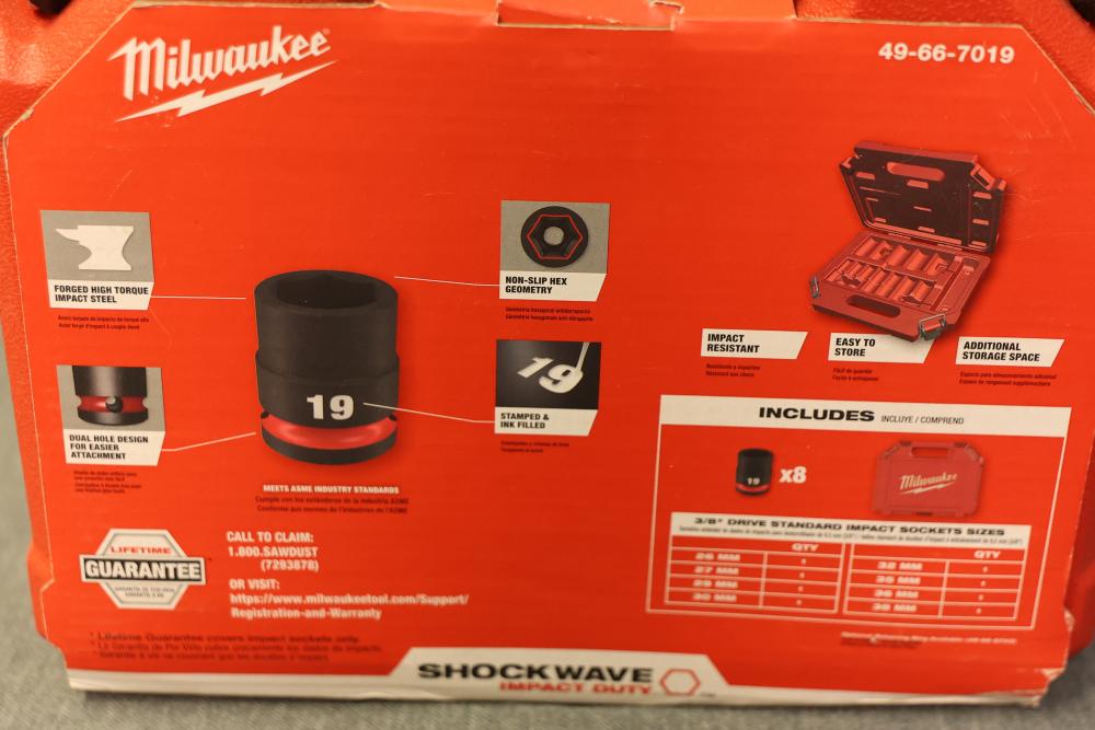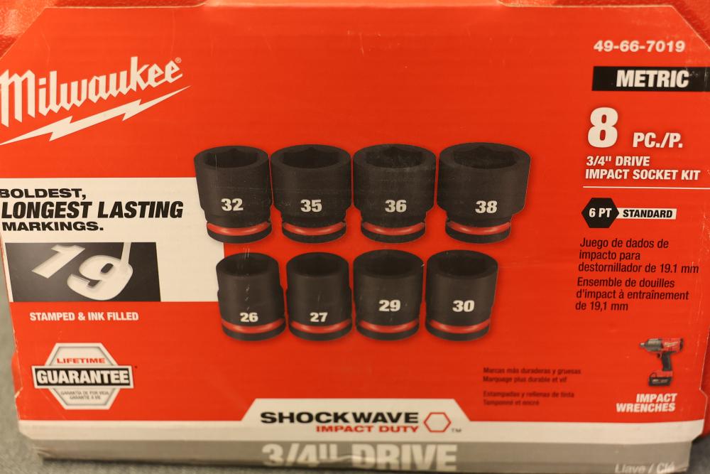 Milwaukee 49-66-7019 8-pc Shockwave 3/4 Inch Drive Metric Standard 6 Point Impact Socket Set. Includes 8 metric sockets ranging from sizes 26mm to 38mm and a durable carrying case. Features stamped and ink-filled size markings for long-lasting readability. Designed for use with impact wrenches. Pickup only.