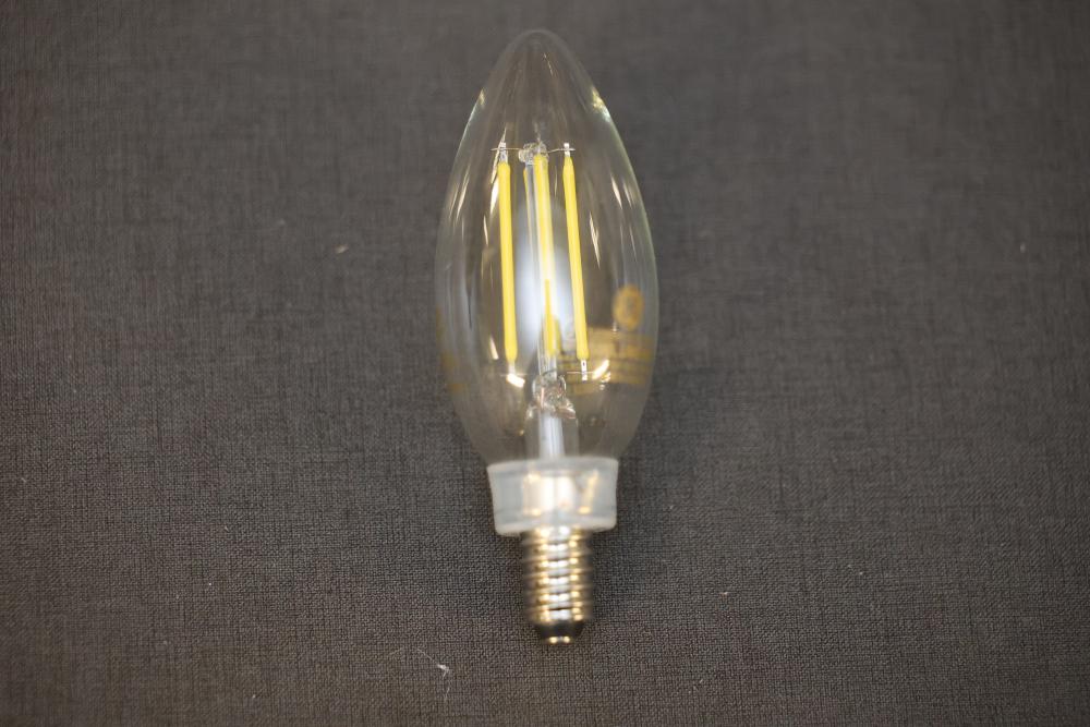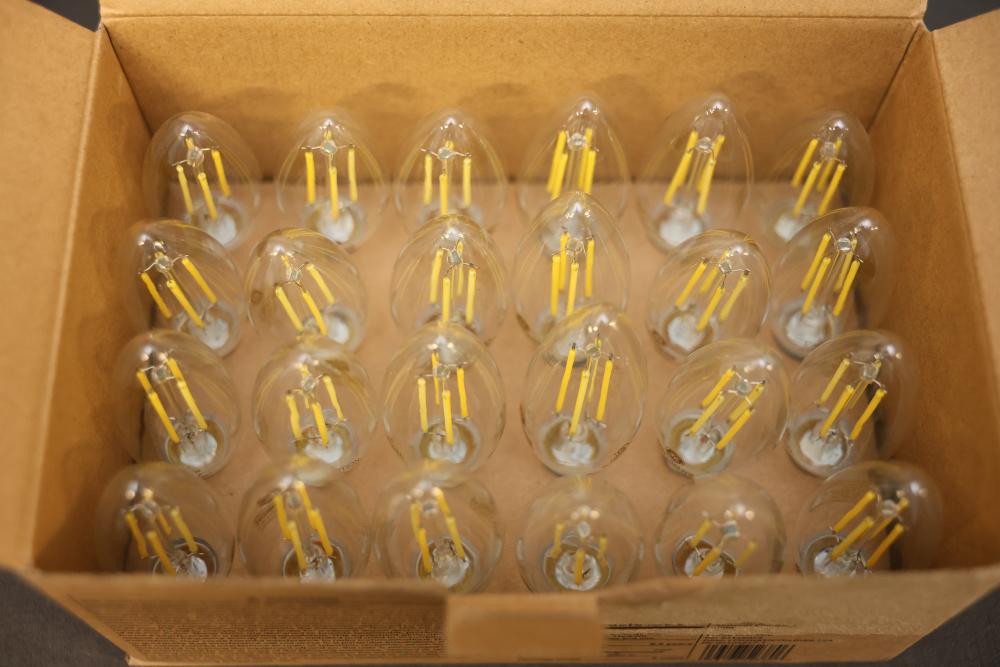 GE Decorative Candle LED B11C Bulbs, 24-Pack, Non-Dimmable. Includes a total of 24 bulbs per box, with four boxes included for a total of 96 bulbs. Bulbs are 60 watts equivalent, use 5 watts, and emit 500 lumens. They feature a candelabra base and have a daylight color temperature of 5000K and a soft white option at 2700K. Rated lifespan of 7500 hours. Pickup only.