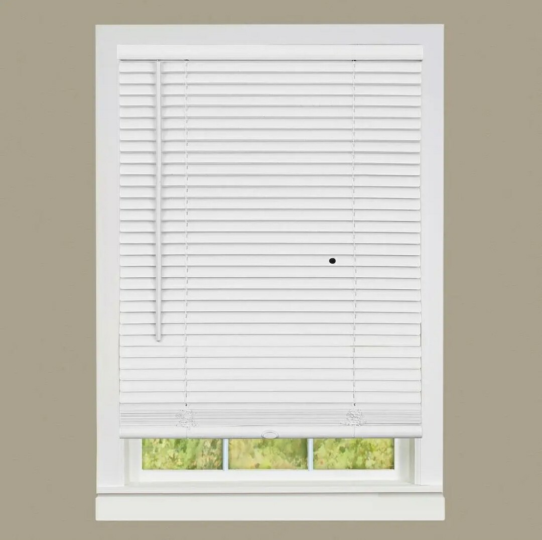 Project Source 0898261 Cordless Vinyl Mini Blind, 58 in x 64 in, White. Designed for light filtering, this blind comes with a cordless feature for safety and convenience. There are two packages in total. Dimensions are 58 inches wide and 64 inches long, with an actual width of 57.5 inches. Pickup only.