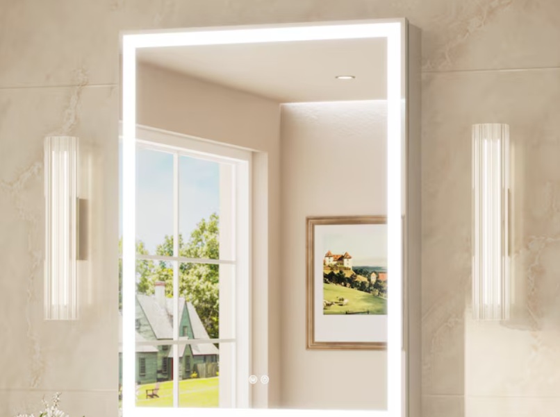 KeonJinn HD-ZCGJG-6181 24 Inch by 32 Inch LED Medicine Cabinet With Defogging Mirror and Light. Features a rectangular aluminum surface mount design with integrated lighting and a defogging mirror. Includes installation hardware and instructions. Pickup only.