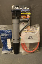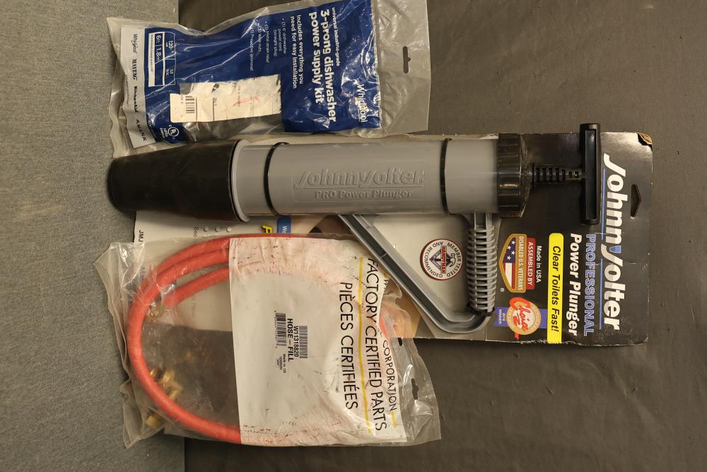Johnny Jolter Pro Power Plunger, Whirlpool 4317824 3-Prong Power Cord Kit, and Whirlpool W11318820 Dishwasher Fill Hose with 90 Degree Elbow Adapter. Includes one plunger for clearing toilets, a 6 ft, 3-prong dishwasher power supply kit with strain relief and wire nuts, and a 3/4 inch fill hose for dishwashers. Pickup only.