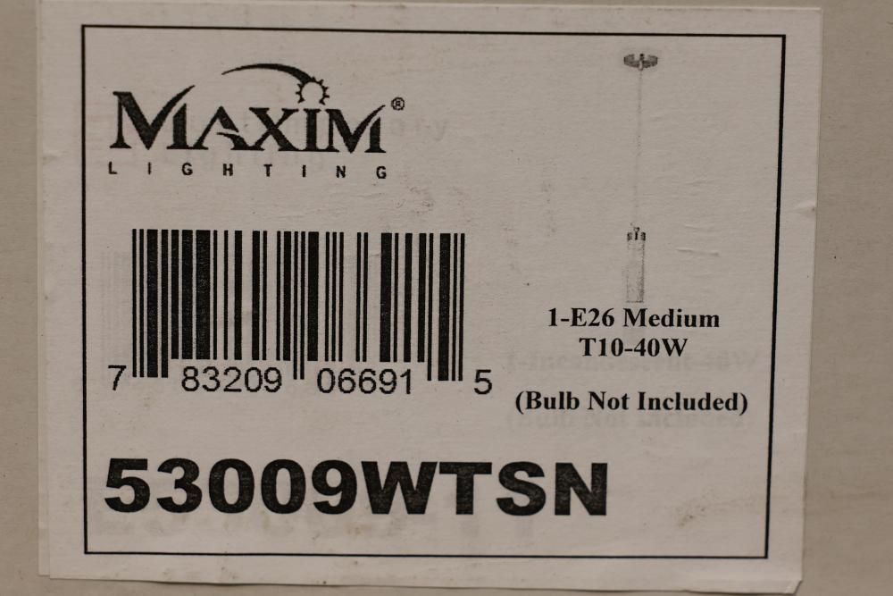 Maxim Lighting Pendant Light Model 53009WTSN with a satin nickel finish. Includes six boxes, each containing a pendant light designed for use with a T10-40W bulb (not included). Features a cylindrical light shade, cord, and mounting hardware. Packaging and product information are intact. Pickup only.