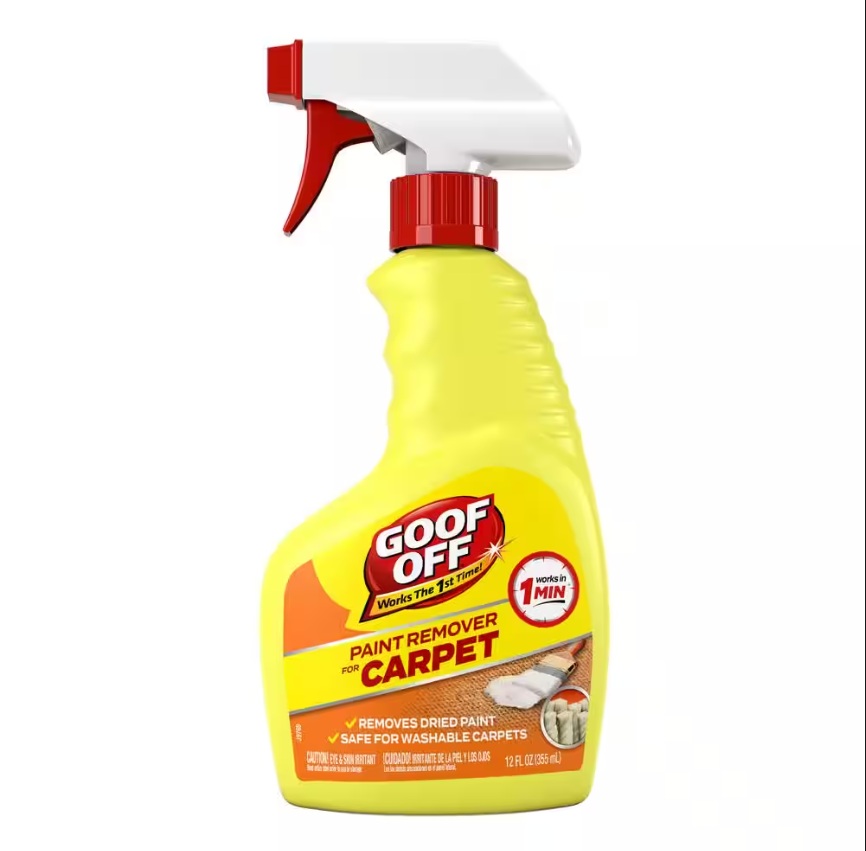 Goof-Off FG910 Paint Remover for Carpet, Full Case of 6 12 fl. oz Bottles. Includes six bottles with spray nozzles designed for removing dried paint from carpets while being safe for washable carpets. The unopened case is intact, and the product packaging is clearly labeled. Pickup only.