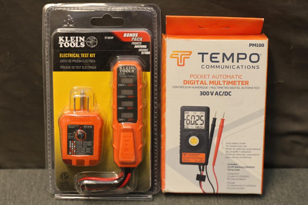 Klein Tools ET45VP Electrical Test Kit and Tempo Communications PM100 Pocket Automatic Digital Multimeter. The ET45VP kit measures AC voltage up to 240V and includes a receptacle tester for diagnostic purposes, featuring durable construction. The PM100 Pocket Automatic Digital Multimeter from Tempo Communications measures AC/DC voltage up to 300V, includes automatic and manual mode selection, and features a pocket-sized design with a large clear display. Both items are in their original packaging and appear unused. Pickup only.