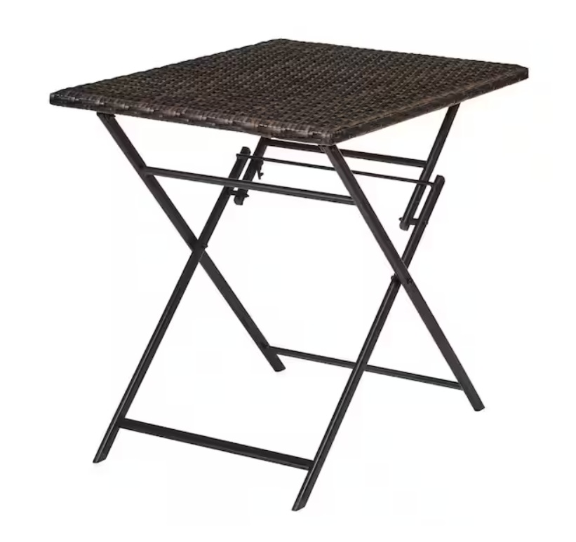 StyleWell Tulane Natural Steel Folding Outdoor Bistro Table. Measures 28.75 inches high, 31.75 inches wide, and 23.73 inches deep. Constructed with a steel frame and designed for outdoor use. New and boxed. Pickup only.