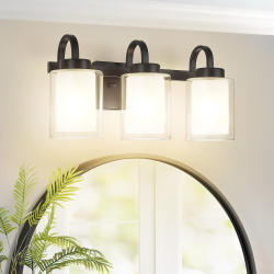 TENXGIN TXVLBK02 3-Light Bathroom Vanity Light in Black with Dual Glass Shades, 18.1 Inches. This fixture features a sleek black finish and dual glass shades, offering both durability and style. The 18.1-inch design is ideal for modern bathroom spaces. Item comes in its original packaging. Pickup only.