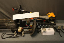 Poulan PP338PT Pro Pole Saw/Trimmer, WEN 6559 6-Inch Jointer with Dust Collection, Craftsman 315.115350 14.4 V 3/8 Inch Drill-Driver Variable Speed and Craftsman 315.110232 14.4 V Cordless Worklight, all previously used. Includes parts for a sink handle, an Everbilt 36 Inch Adjustable Wall Mount Storage Tool Organizer, and various hanging hooks. Pickup only.