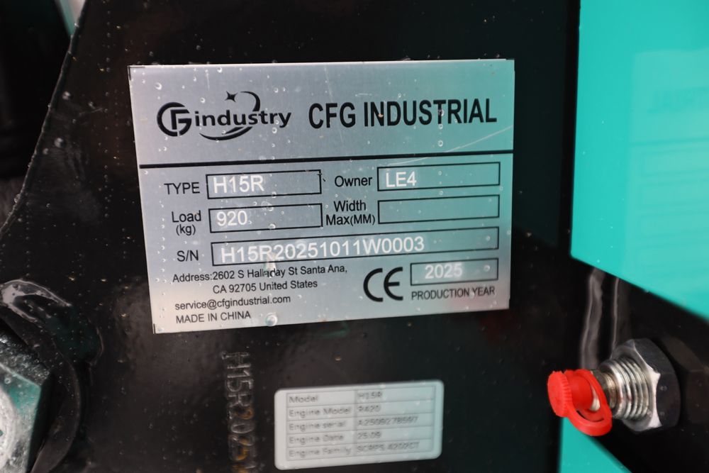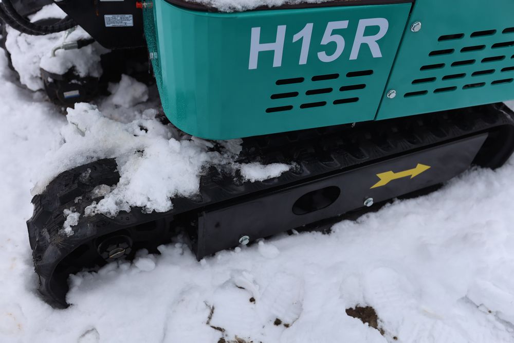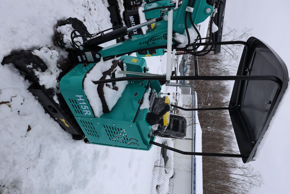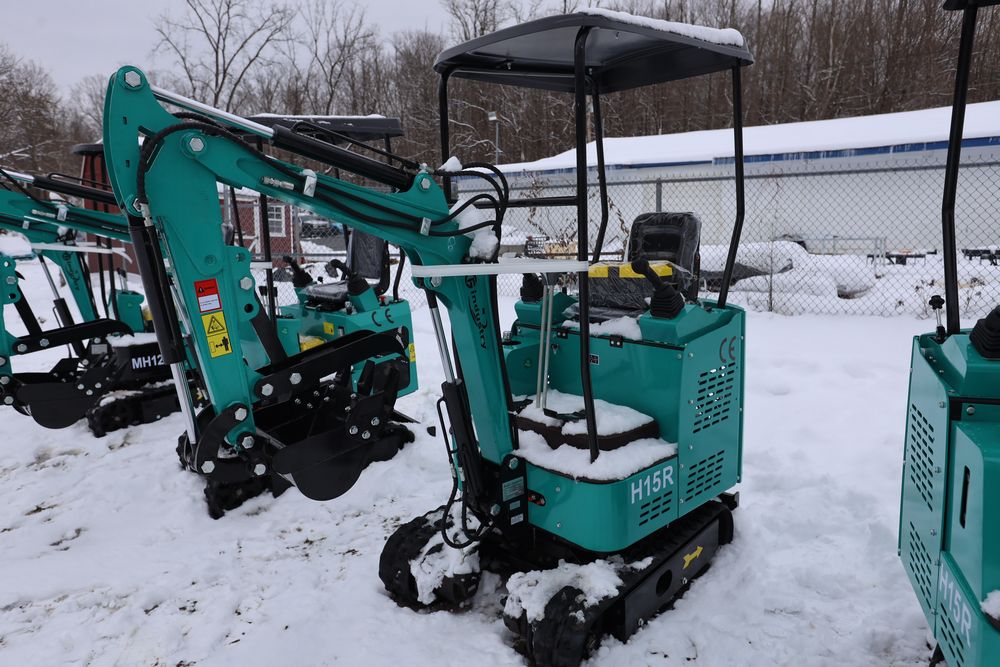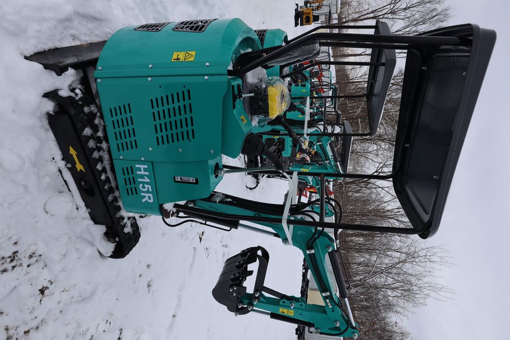 New 2026 CFG Industrial gas powered mini Excavator model H15R with 420cc gasoline engine, bucket, 4' long tracks, 38.5" wide base, 6" wide tracks, canopy, hydraulic boom & bucket controls, pilot system, thumb, dozer blade. Hours reading less than 1 hour.