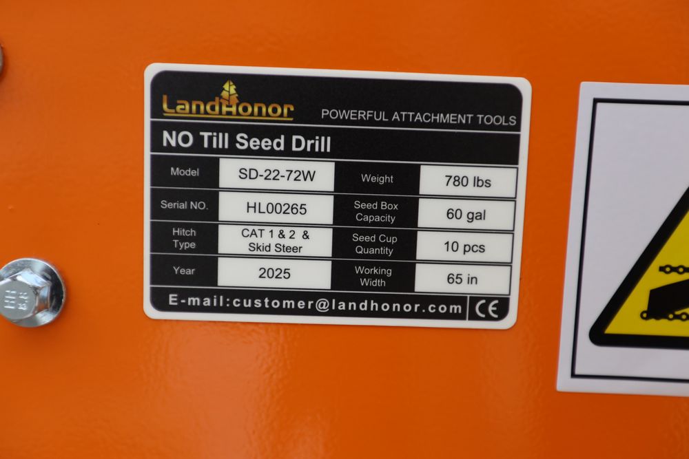New 2026 Landhonor No Till Seed Drill Model SD-22-72W Fits Skid steer and 3-Point Quick Hitch.