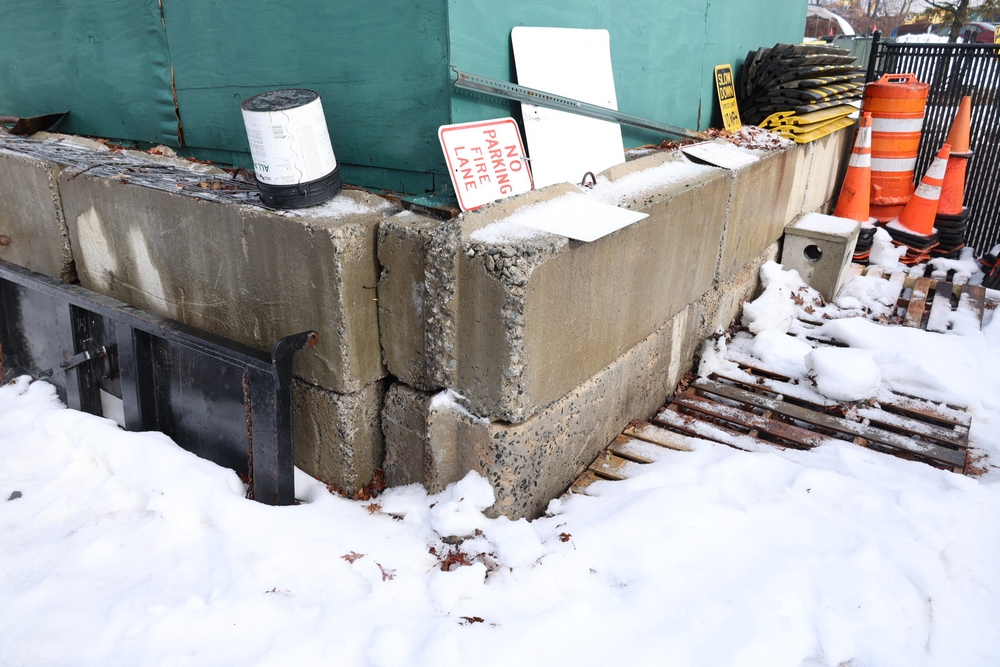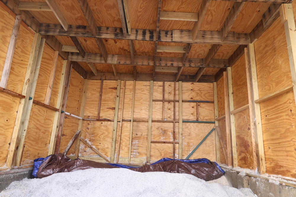 Salt storage shed structure measuring approximately 174 inch x 178 inch, constructed with wood framing and plywood sheathing on precast concrete barrier blocks. Open front design for material loading. Lot includes the wood shed structure and the stacked concrete barrier blocks shown. Seller will disassemble for transport; buyer to call after winning to discuss disassembly.