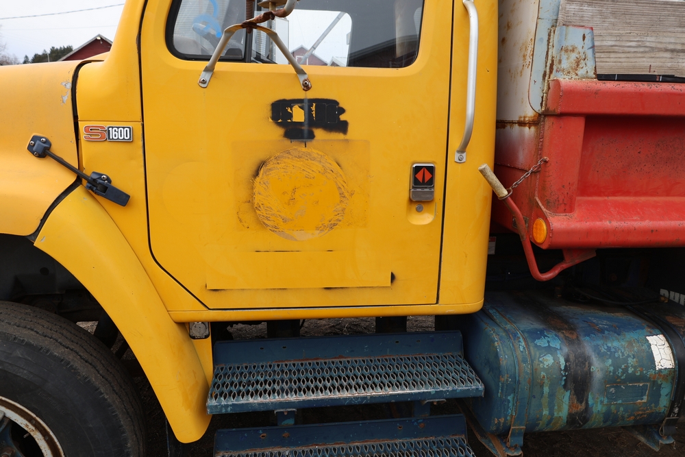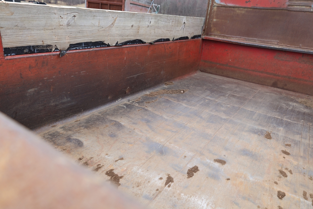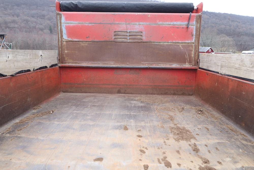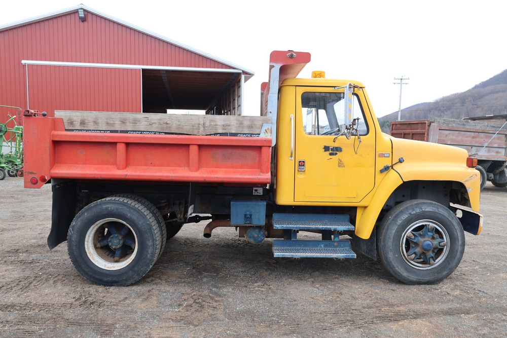 1989 International 1654 with a 7.3L V8 diesel engine. VIN: 1HTLAZP77KH616140. Odometer reading: 184697. Body: electric dump bed. Yellow cab, red dump bed with Pro-Class marking, dual rear wheels, manual transmission, bench seat, amber cab light, side mirrors, step plates, fuel tank mounted along frame, rear hitch, control box mounted inside cab, wood side boards on dump bed. Runs and drives. Title and key available.